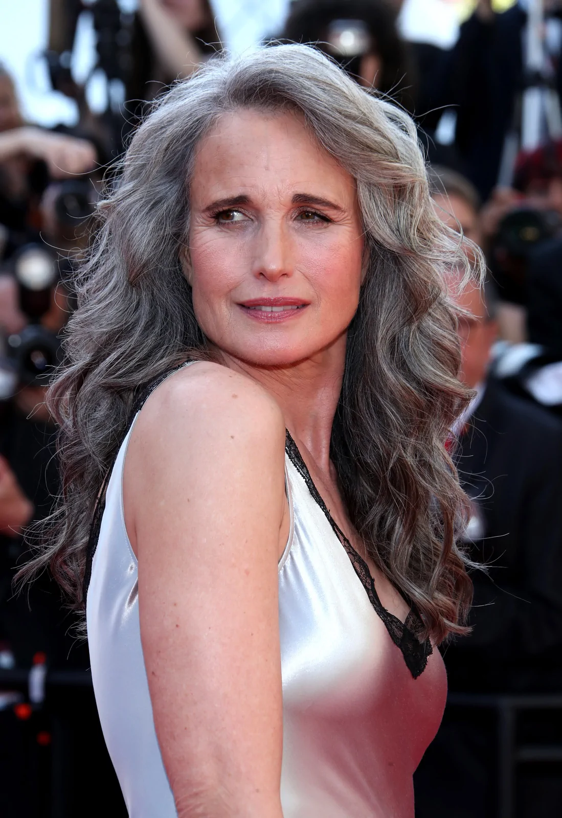 At the 78th Cannes Film Festival on May 15, 2025, Andie MacDowell stunned onlookers at the premiere of Case 137 with a look that was both timelessly elegant and daringly modern. Departing from her previous Cannes aesthetics, the celebrated actress embraced a striking silver theme that perfectly complemented her signature “silver fox” hair. Her silver slip dress, delicately adorned with a black lace trim, served as a refined yet bold statement on the red carpet—melding classic glamour with an invigorating contemporary twist.