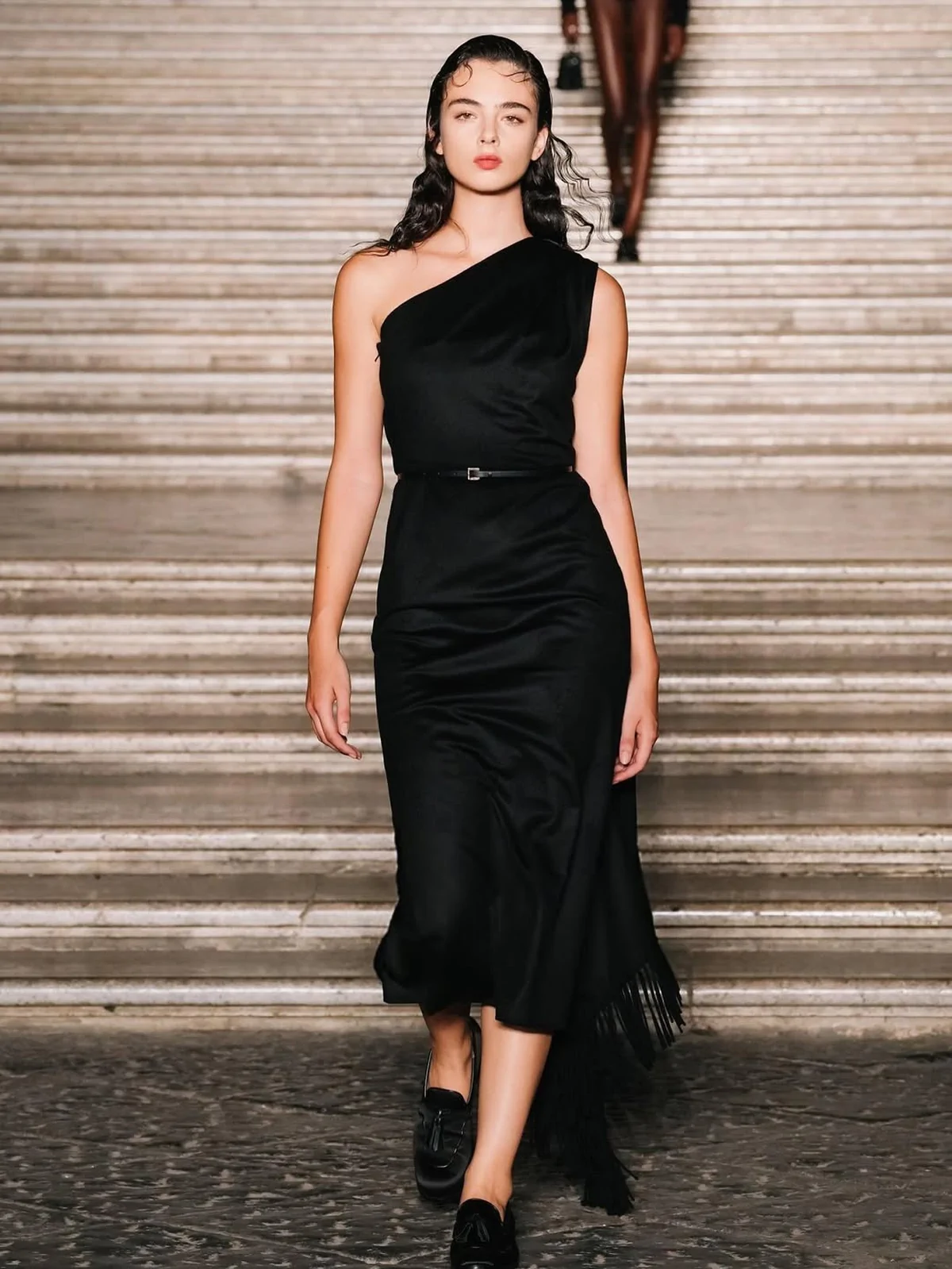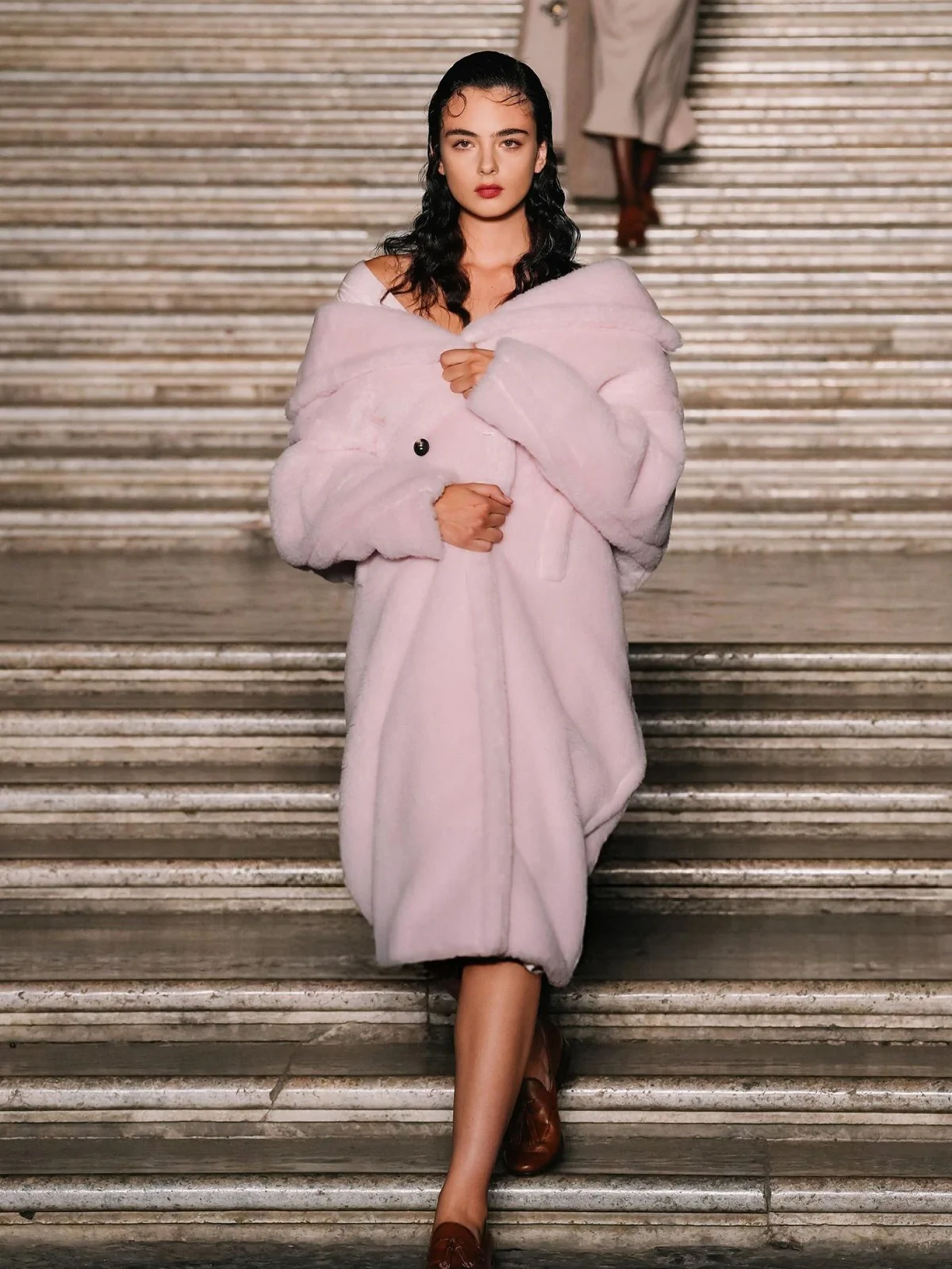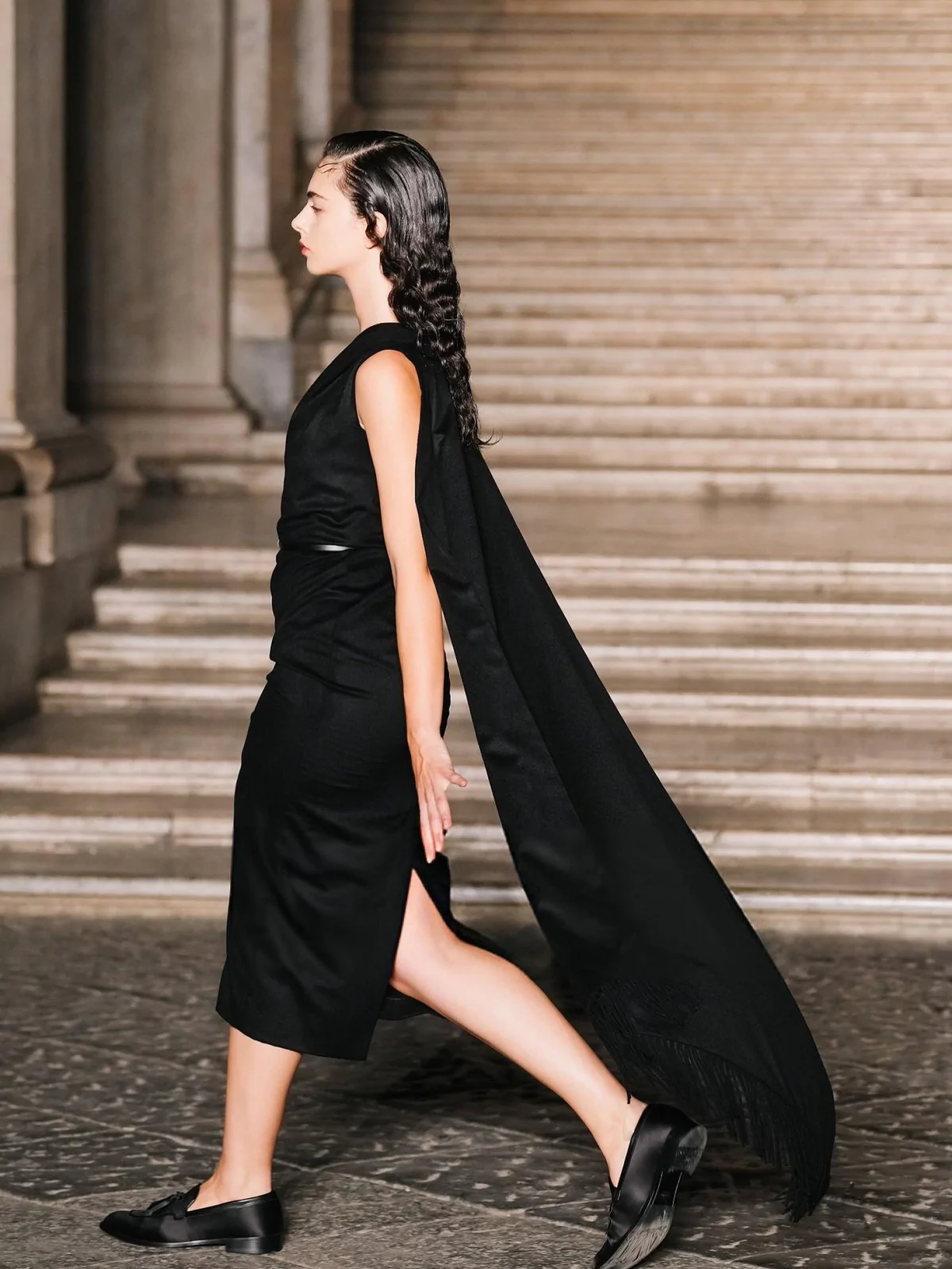 The show itself was a visual symphony of elegance and heritage. Max Mara’s creative director, Ian Griffiths, presented a collection that blended precise tailoring with Neapolitan flair, featuring minimalist suits, airy capes, and luxurious fabrics like fluid wools and silks adorned with E. Marinella micro-motifs. The palace’s Baroque and Neoclassical architecture wasn’t just a backdrop—it became part of the narrative, enhancing the collection’s dialogue between aristocratic memory and modern life.