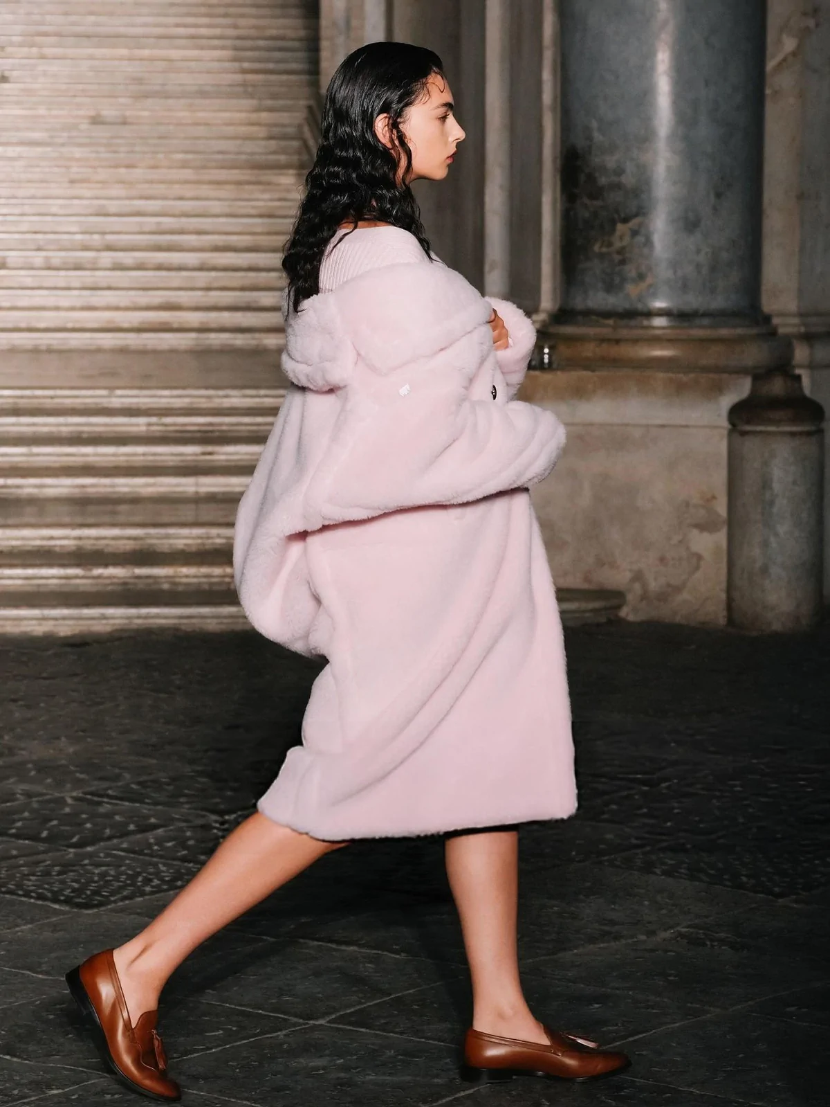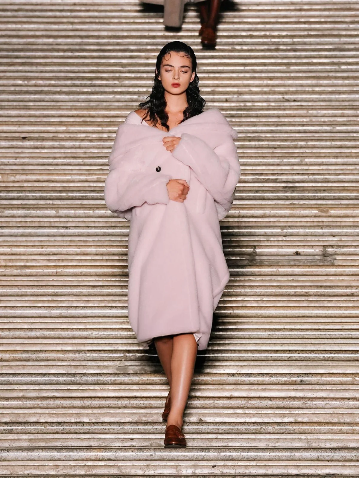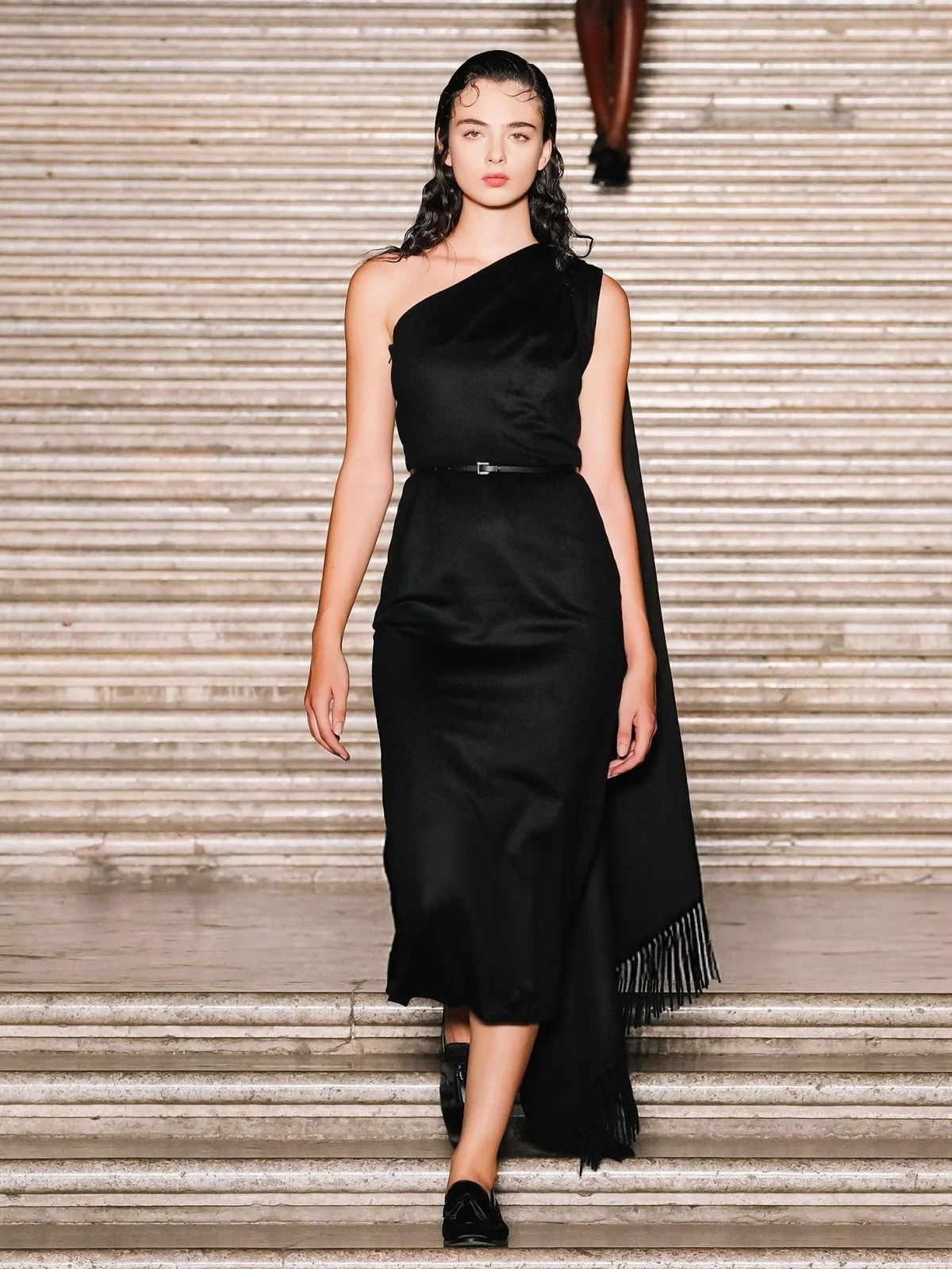 The show itself was a visual symphony of elegance and heritage. Max Mara’s creative director, Ian Griffiths, presented a collection that blended precise tailoring with Neapolitan flair, featuring minimalist suits, airy capes, and luxurious fabrics like fluid wools and silks adorned with E. Marinella micro-motifs. The palace’s Baroque and Neoclassical architecture wasn’t just a backdrop—it became part of the narrative, enhancing the collection’s dialogue between aristocratic memory and modern life.