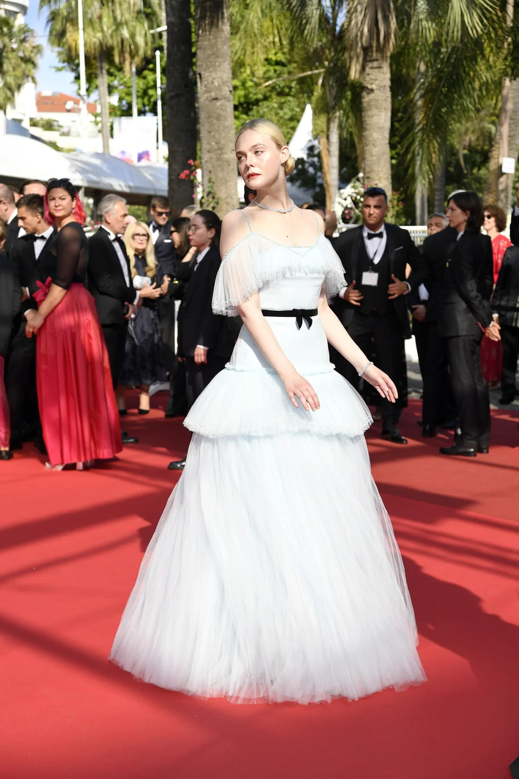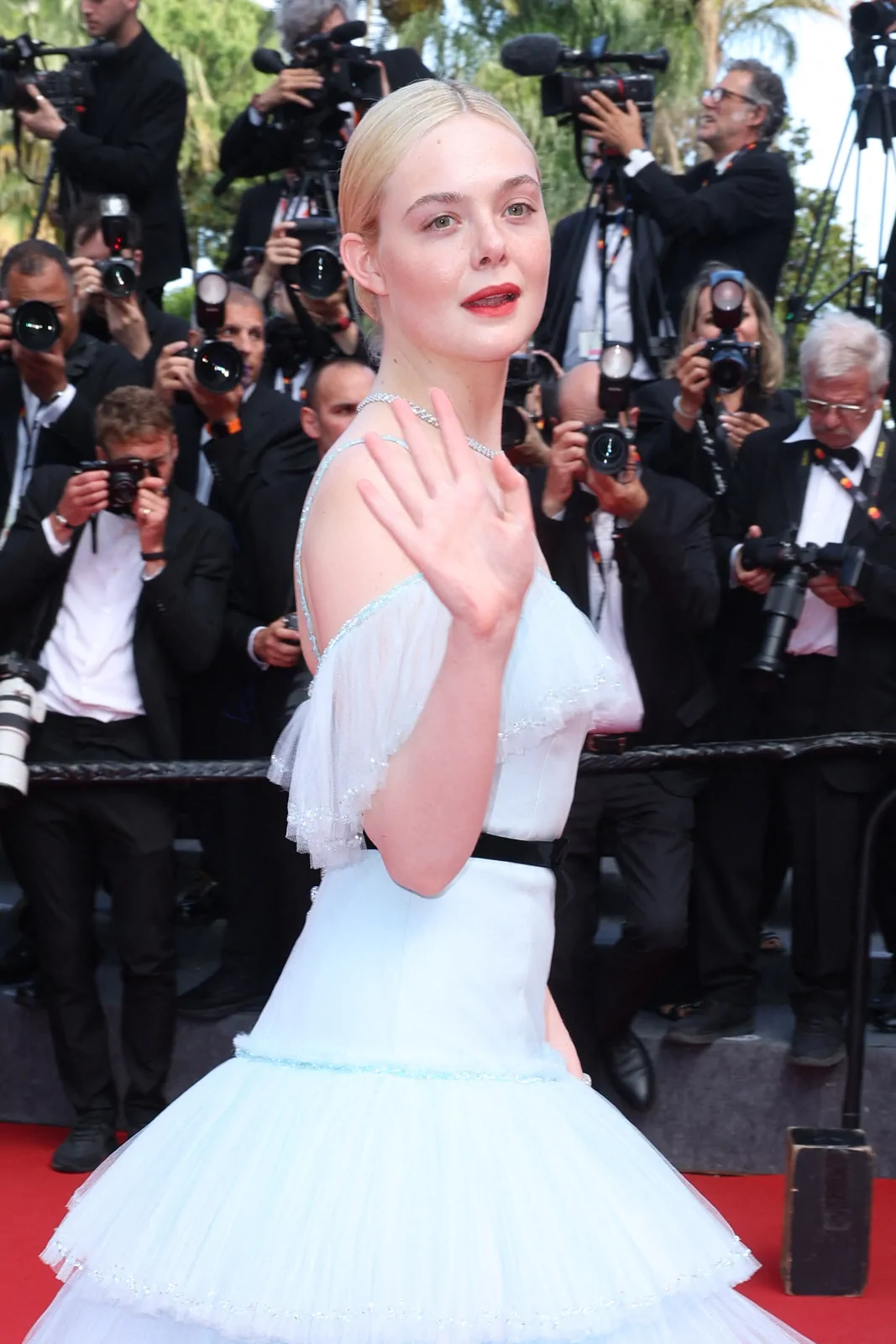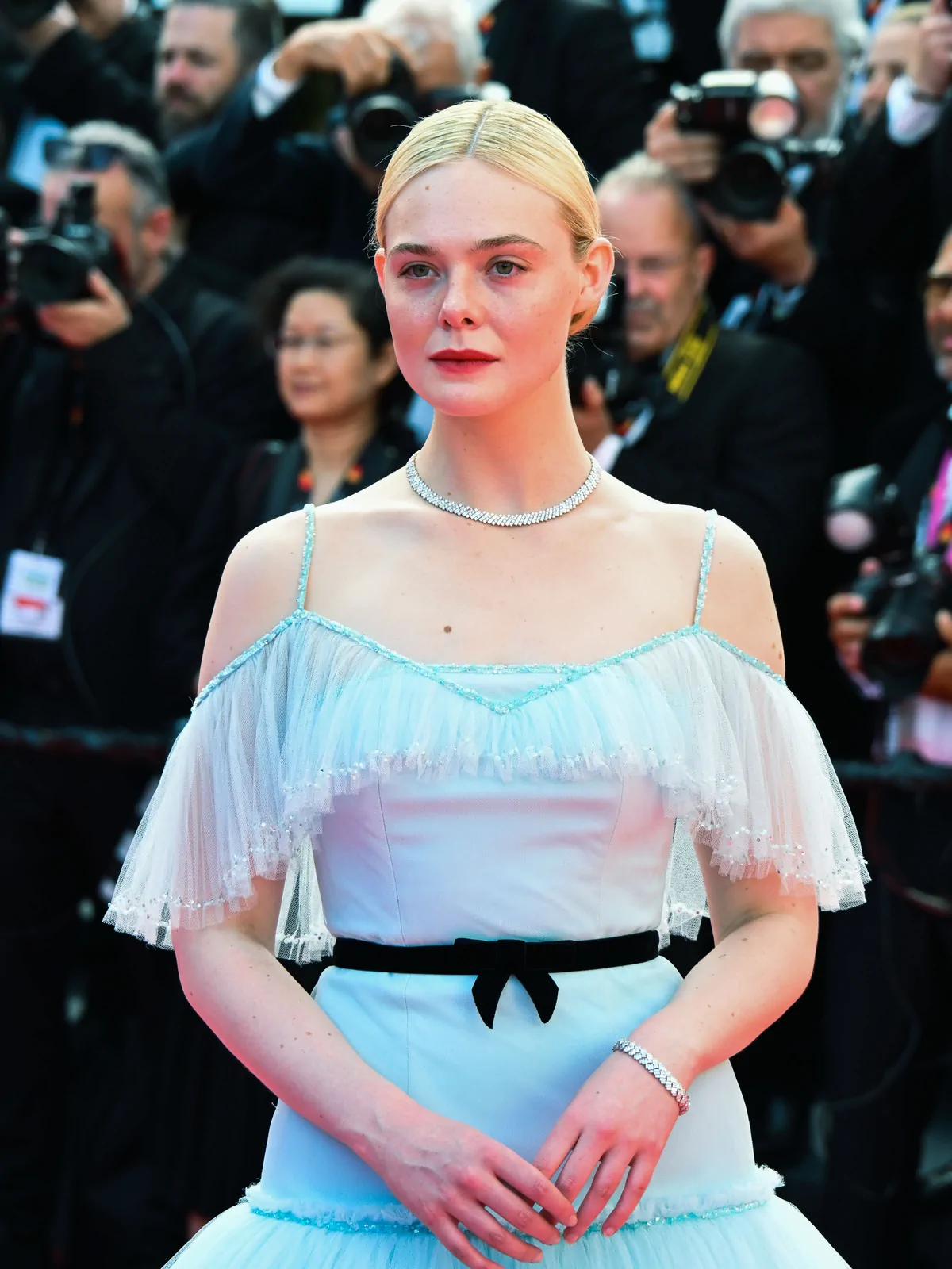 Elle Fanning stole the spotlight at the Closing Ceremony of the 78th Cannes Film Festival on May 24, 2025, embodying a modern fairy-tale elegance along the storied red carpet. The American actress dazzled in a pastel blue Chanel gown—a dreamy creation crafted from silk, crepe, and tulle—that featured delicate ruffles, a romantic Bardot neckline, and a princess skirt gracefully cinched at the waist with a black ribbon belt. The look, combining a classical sense of refinement with a contemporary twist, underscored how Fanning’s style continually evolves to suit both her youthful spirit and mature elegance.