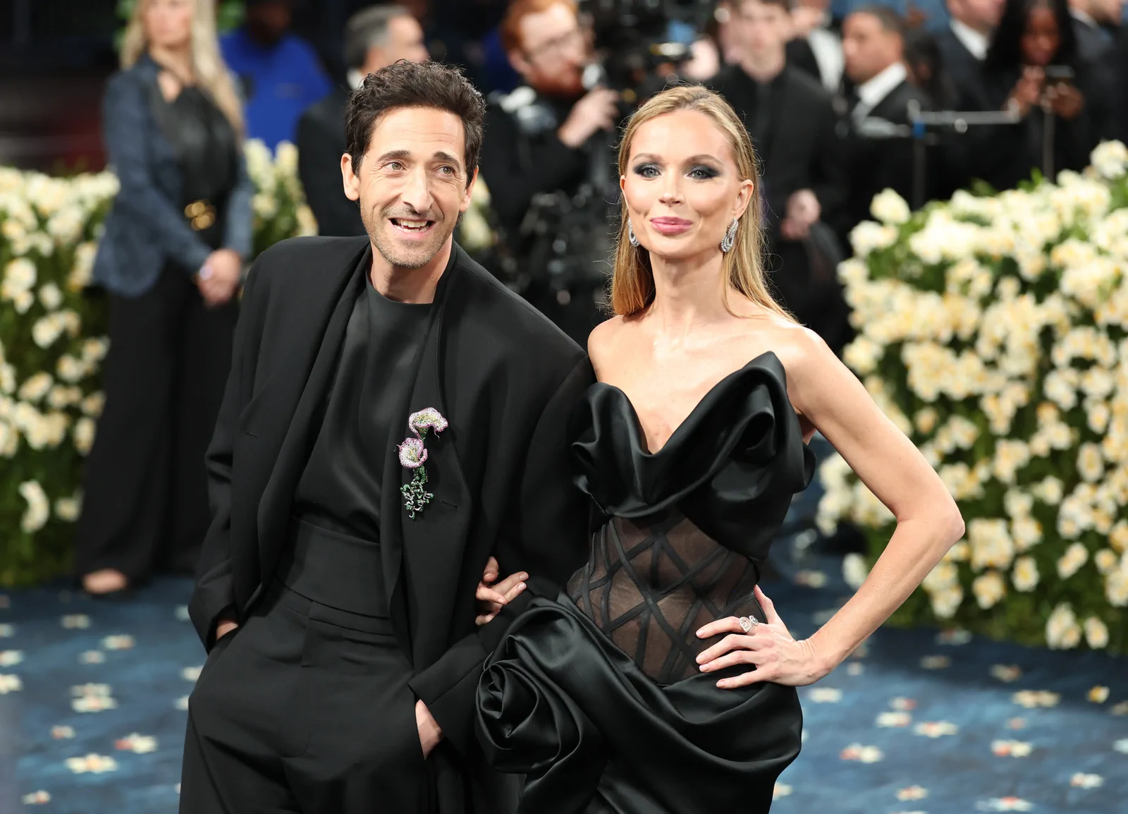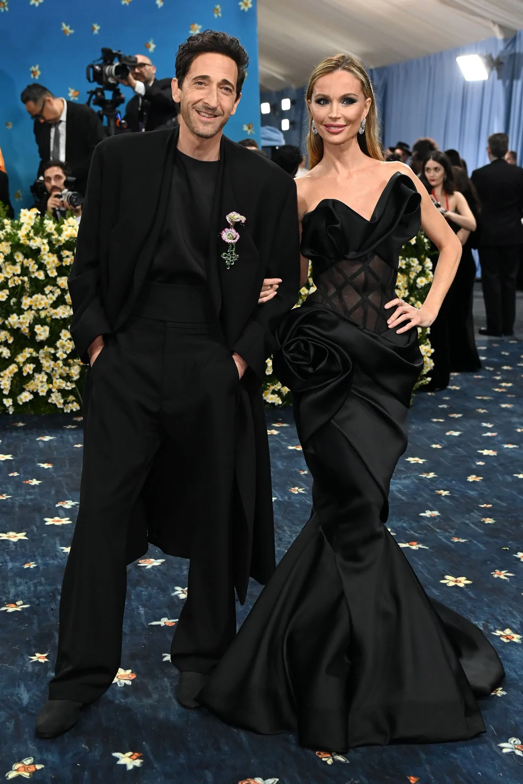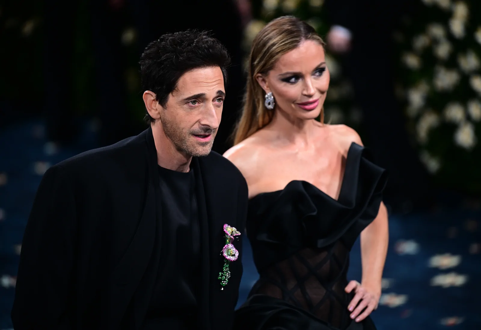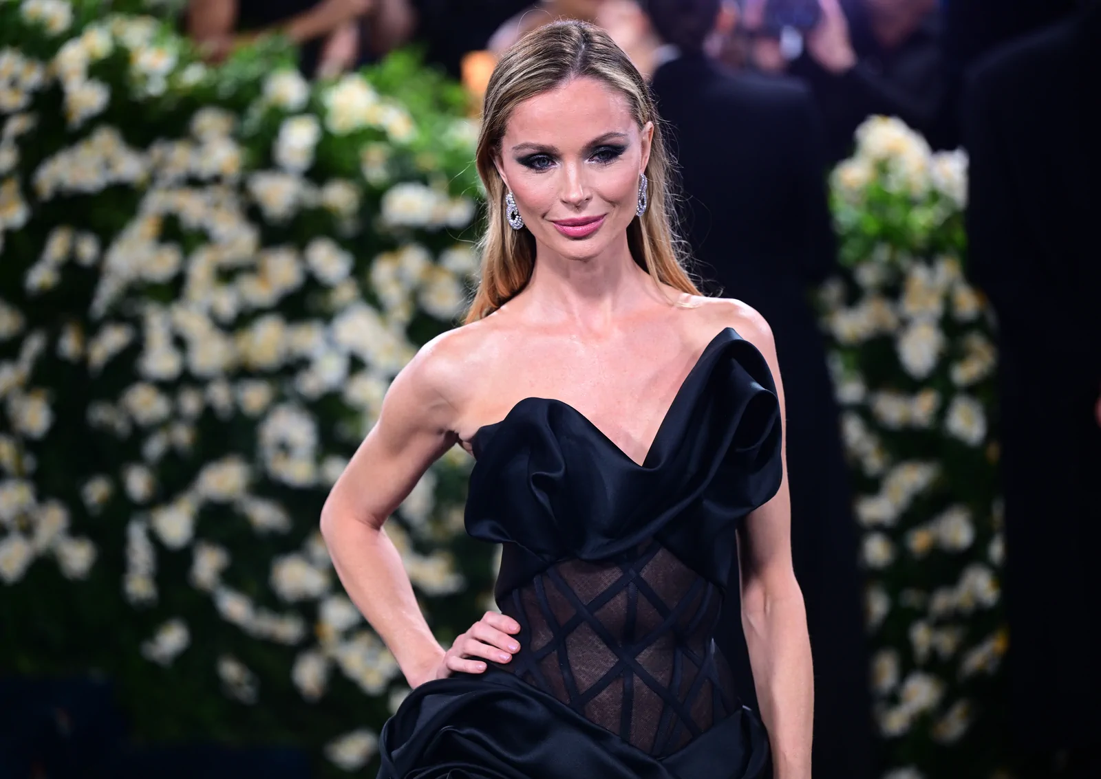 Arriving in a custom Marchesa ensemble, Chapman showcased a sculptural duchess satin gown that fused impeccable tailoring with avant‑garde design. The gown featured intricate rose‑drape detailing along the skirt and an exposed illusion tulle corset, creating an artful interplay between structure and fluid elegance. Complemented by a flawlessly executed makeup look—likely enhanced by signature high‑end products—and understated accessories that punctuated the overall aesthetic, her red carpet appearance stood as a testament to both heritage and high-fashion innovation.