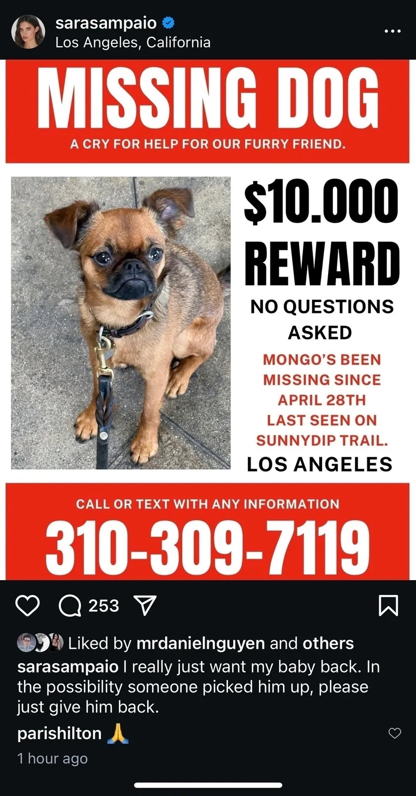 Sara Sampaio is urgently searching for her missing dog, Mongo, who escaped from her fenced property in Hollywood Hills on April 28, 2025. The model has taken to social media, pleading for help and offering a $10,000 reward for Mongo’s safe return.