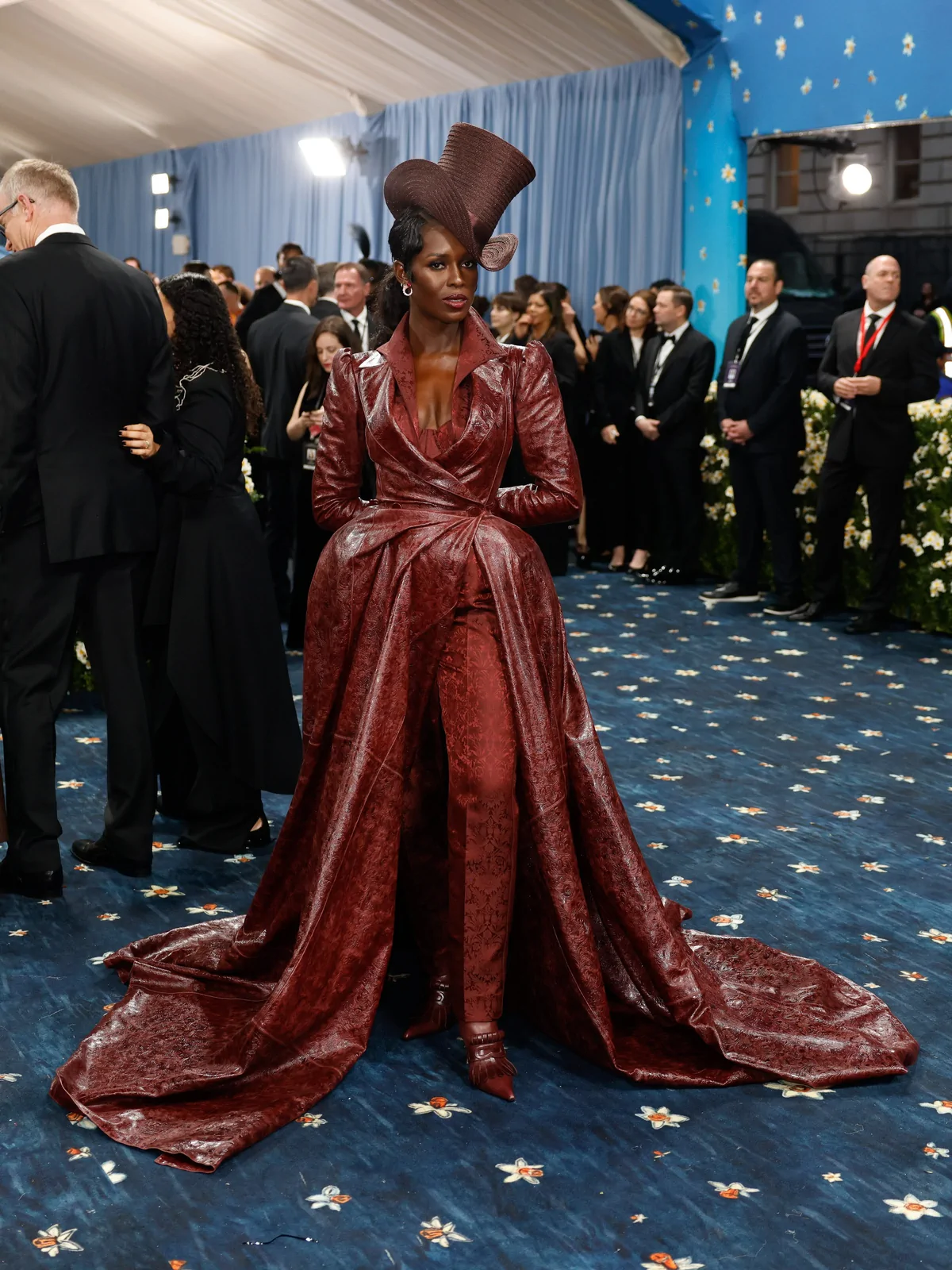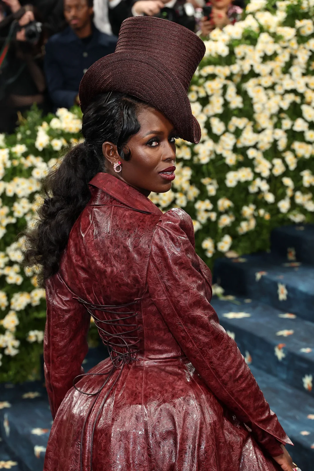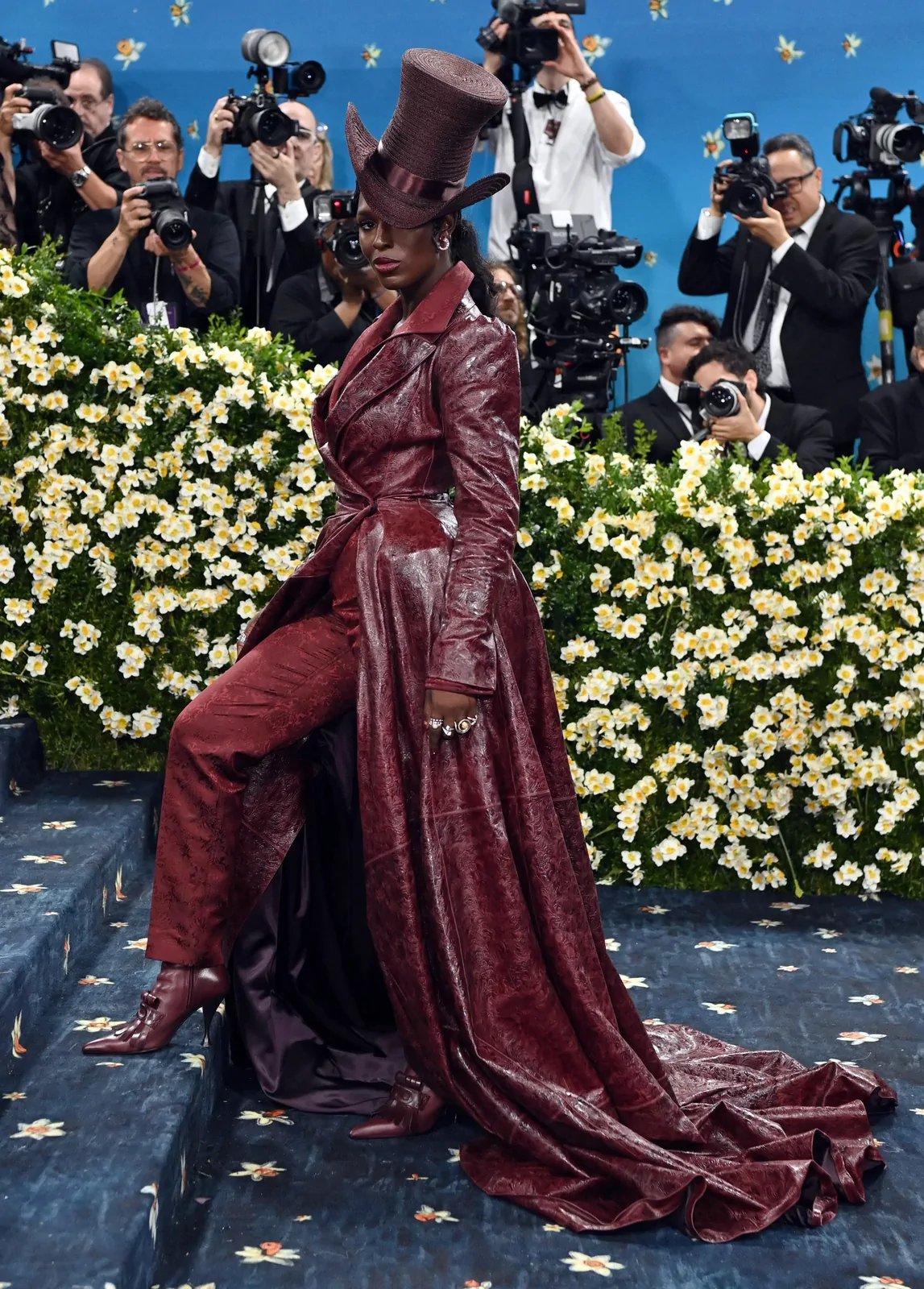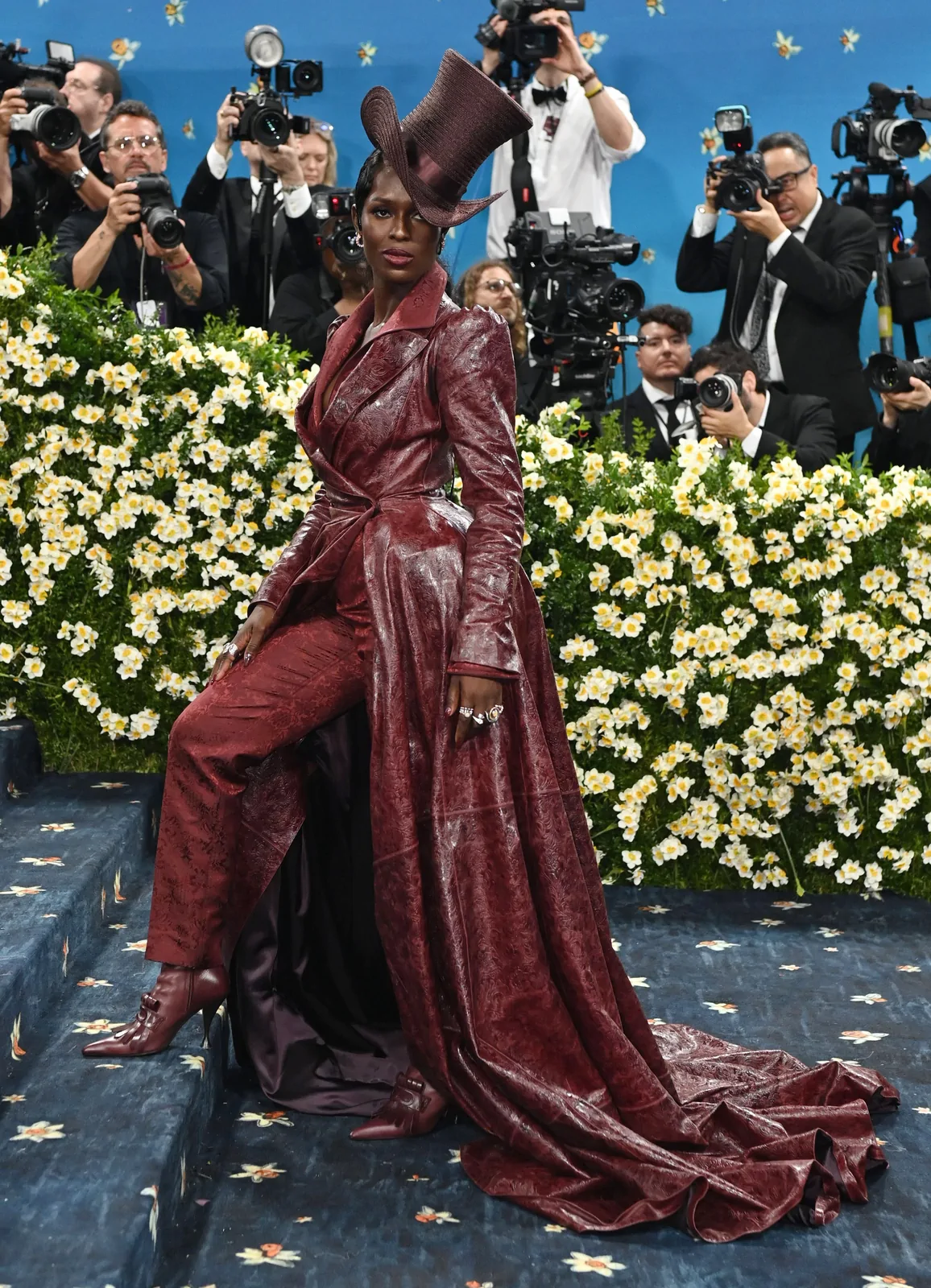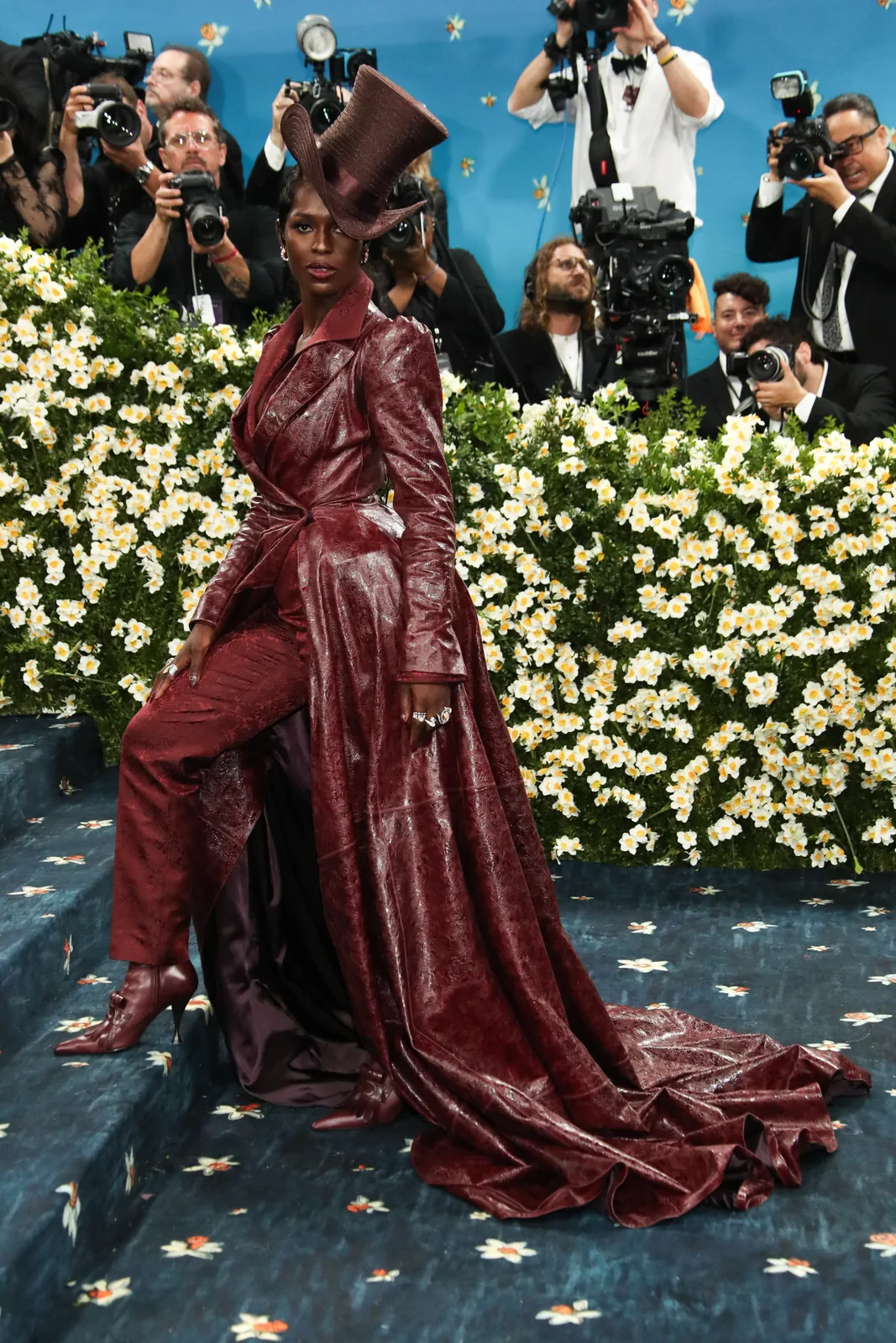 Her custom burgundy leather coat stole the spotlight with its striking embossed floral detailing and meticulous construction. The design featured a cinched waist that gracefully flowed into a subtle bustle, echoing the sculpted silhouettes of the Victorian era while meeting the gala’s “Tailored for You” dress code. A boldly styled top hat—an unexpected nod to equestrian chic—completed her look, highlighting the creative reinterpretation of menswear elements and infusing the outfit with a touch of regal panache.