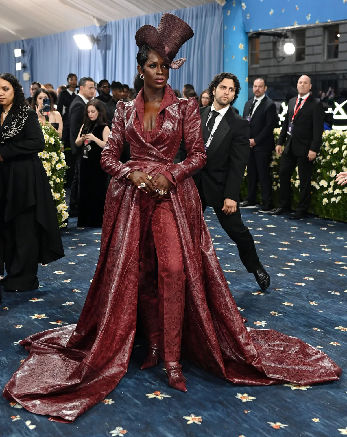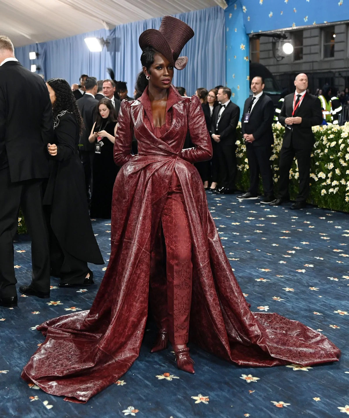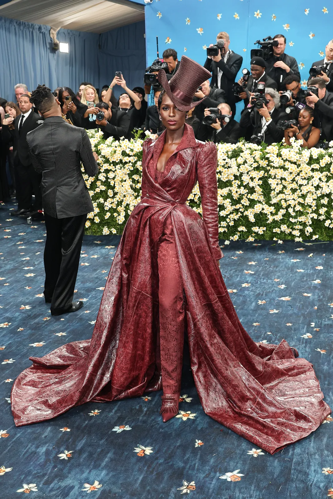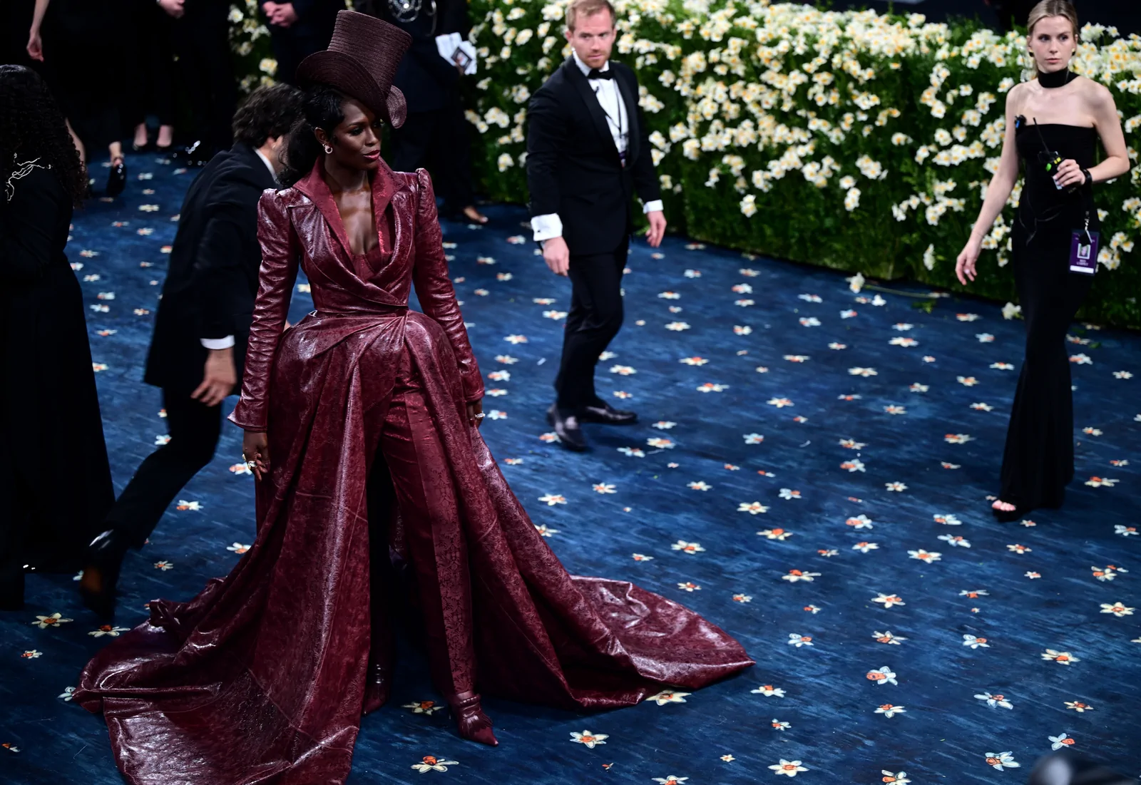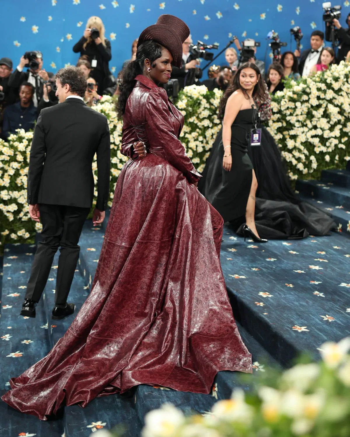 Her custom burgundy leather coat stole the spotlight with its striking embossed floral detailing and meticulous construction. The design featured a cinched waist that gracefully flowed into a subtle bustle, echoing the sculpted silhouettes of the Victorian era while meeting the gala’s “Tailored for You” dress code. A boldly styled top hat—an unexpected nod to equestrian chic—completed her look, highlighting the creative reinterpretation of menswear elements and infusing the outfit with a touch of regal panache.