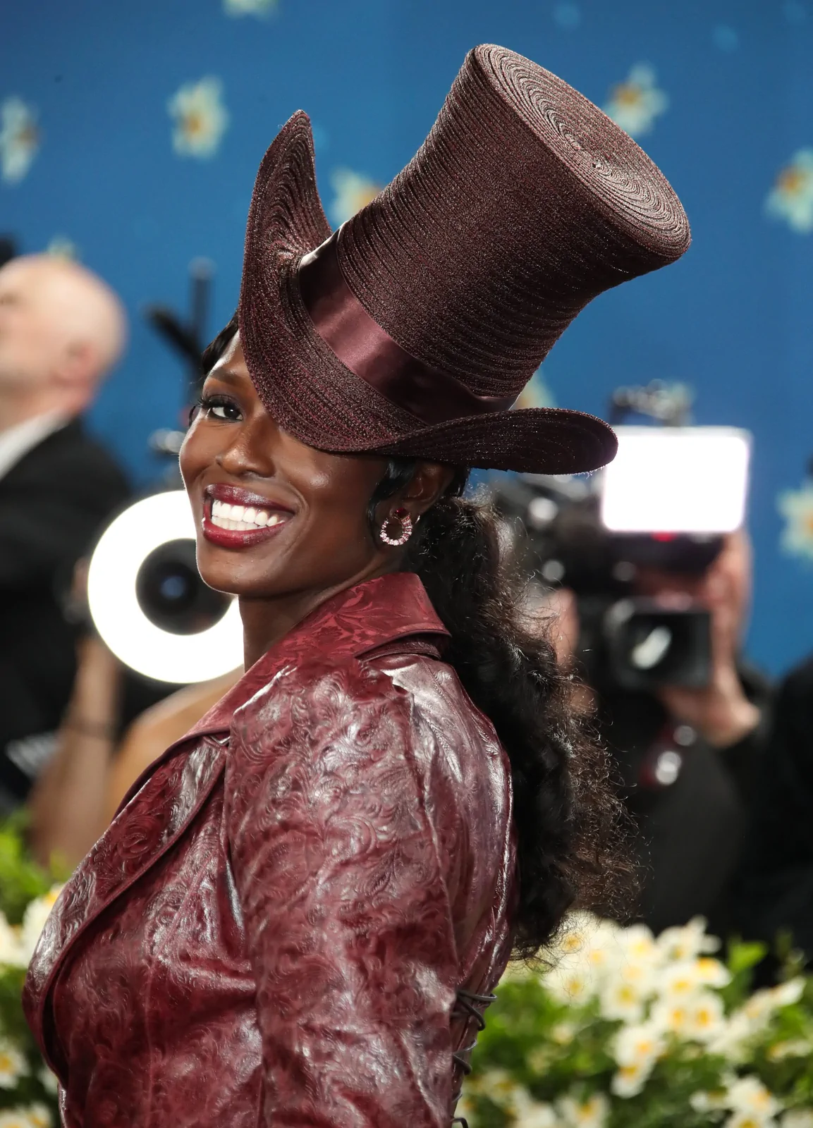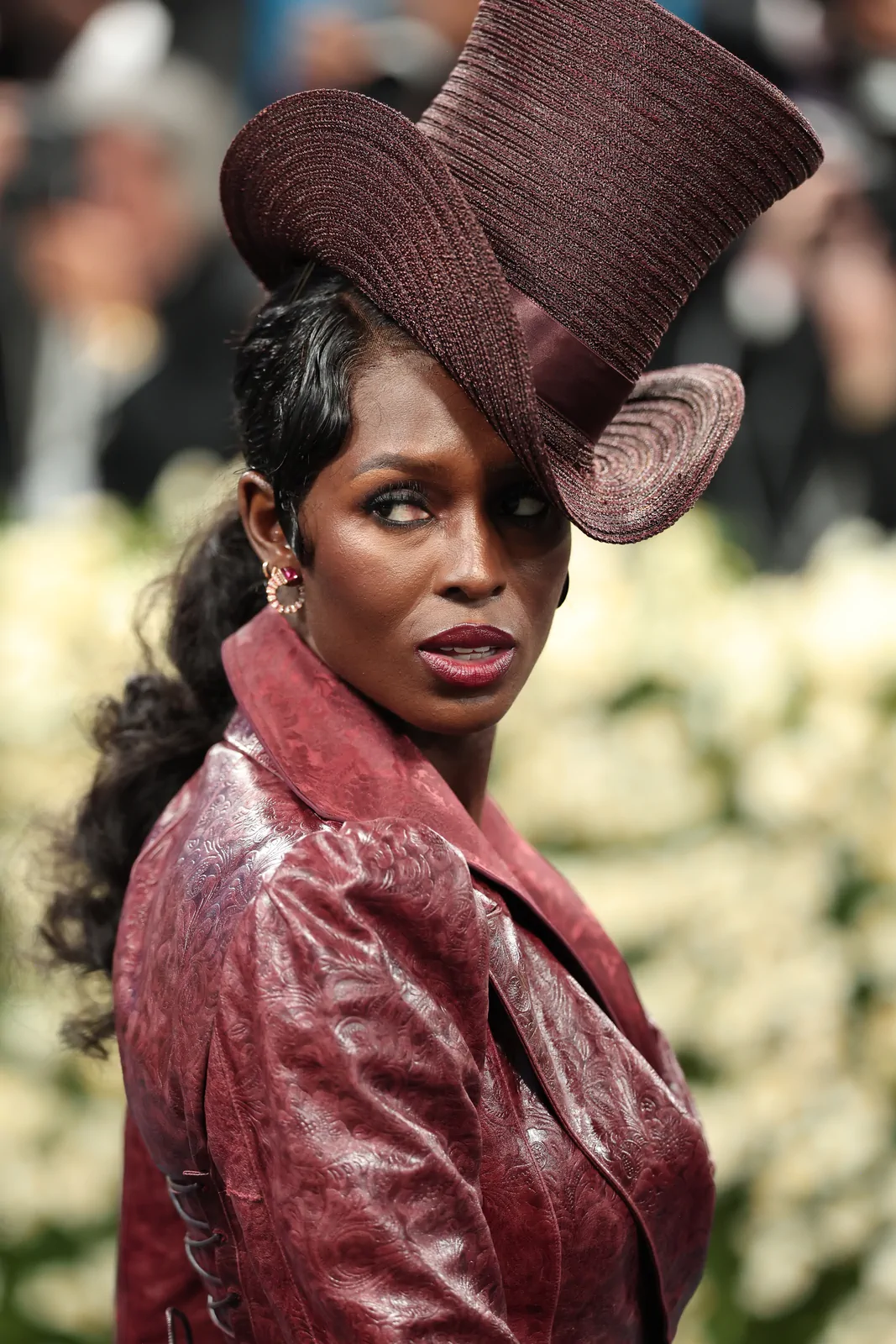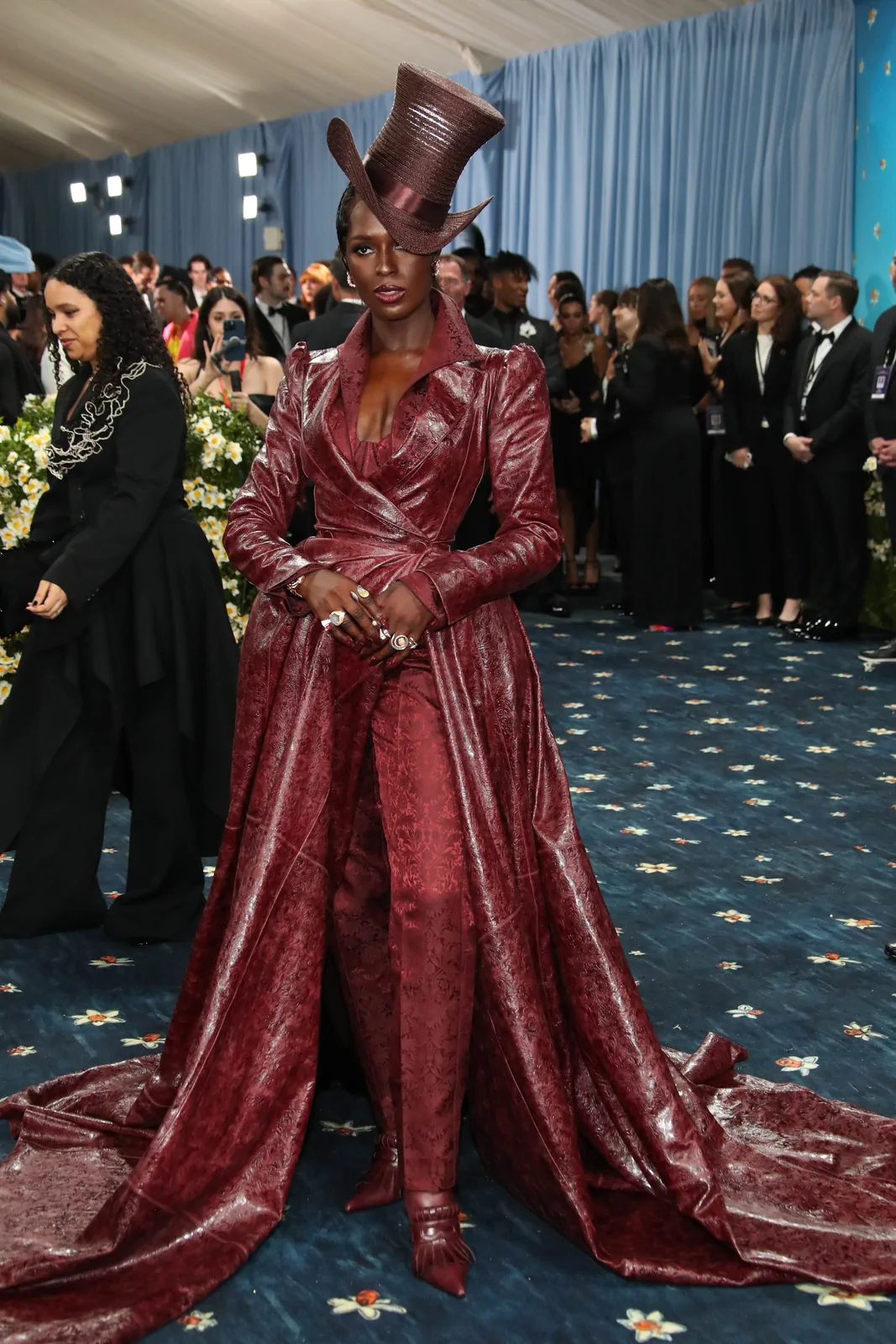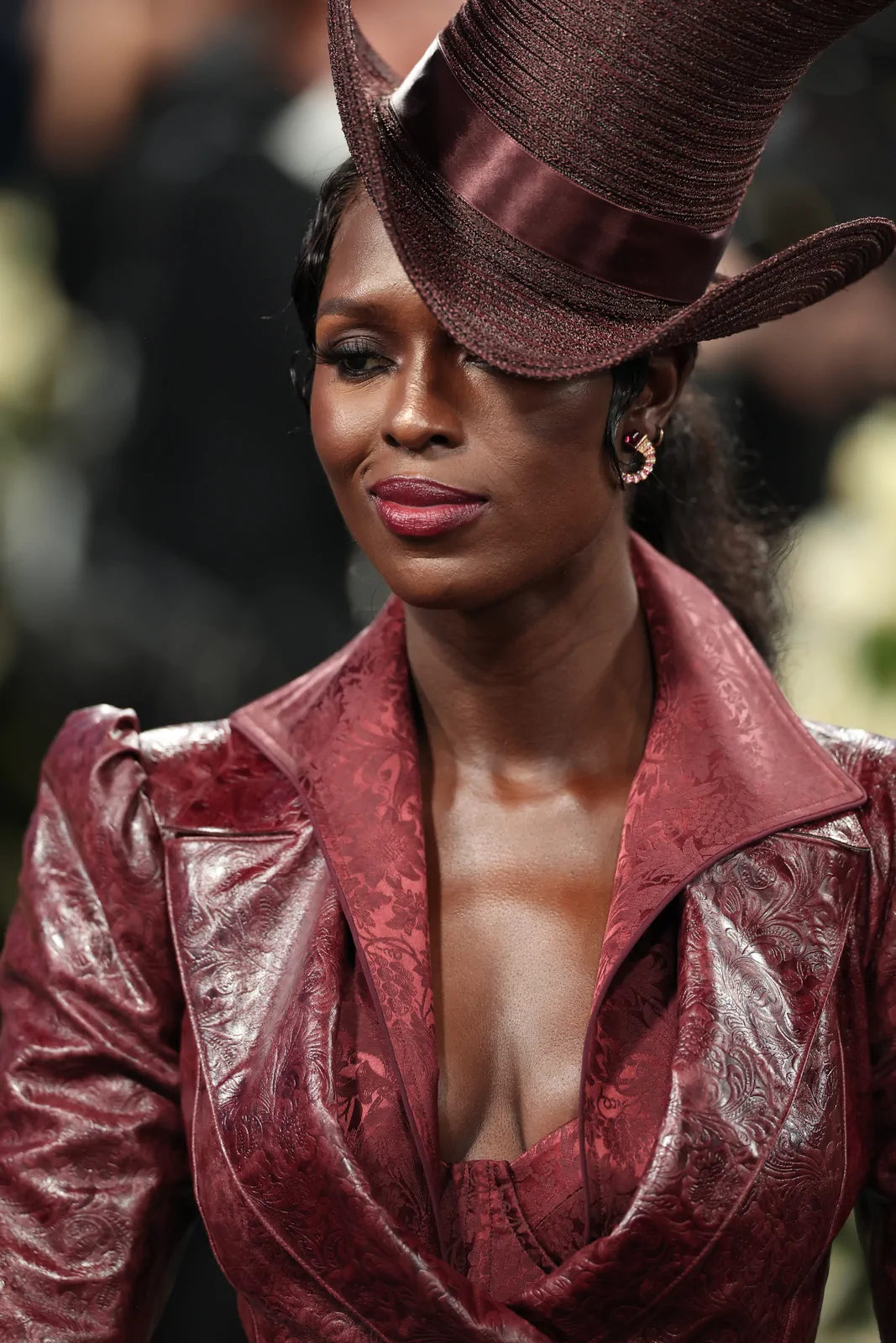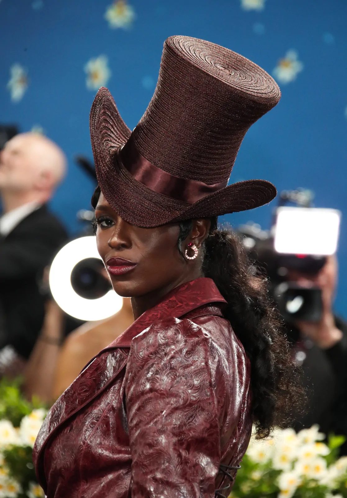 Her custom burgundy leather coat stole the spotlight with its striking embossed floral detailing and meticulous construction. The design featured a cinched waist that gracefully flowed into a subtle bustle, echoing the sculpted silhouettes of the Victorian era while meeting the gala’s “Tailored for You” dress code. A boldly styled top hat—an unexpected nod to equestrian chic—completed her look, highlighting the creative reinterpretation of menswear elements and infusing the outfit with a touch of regal panache.
