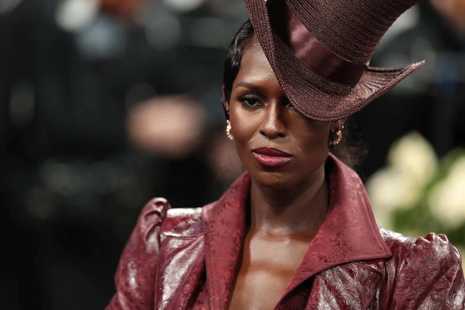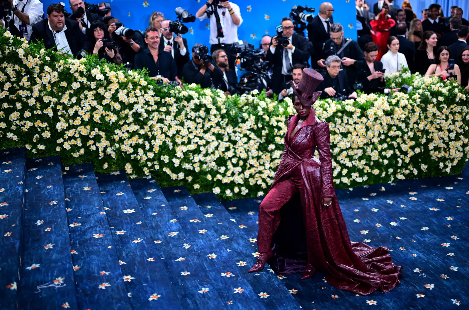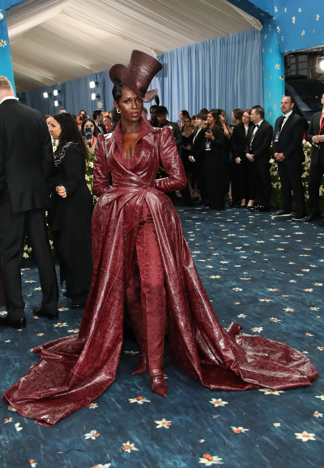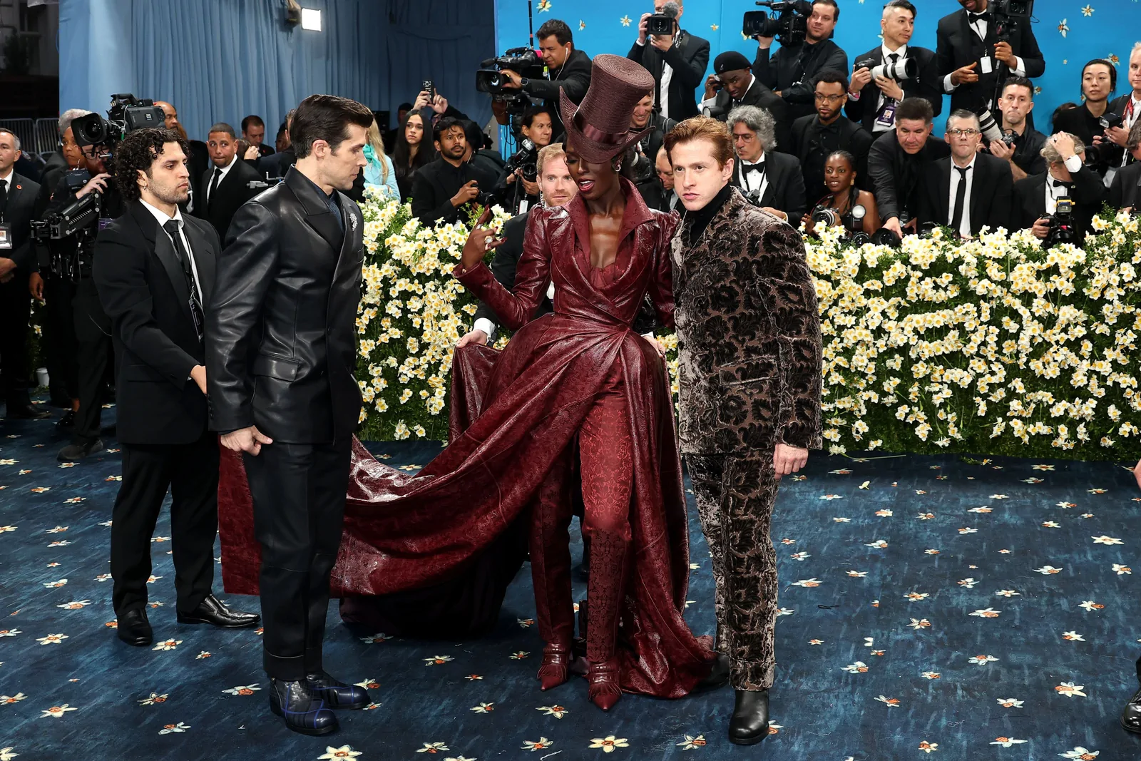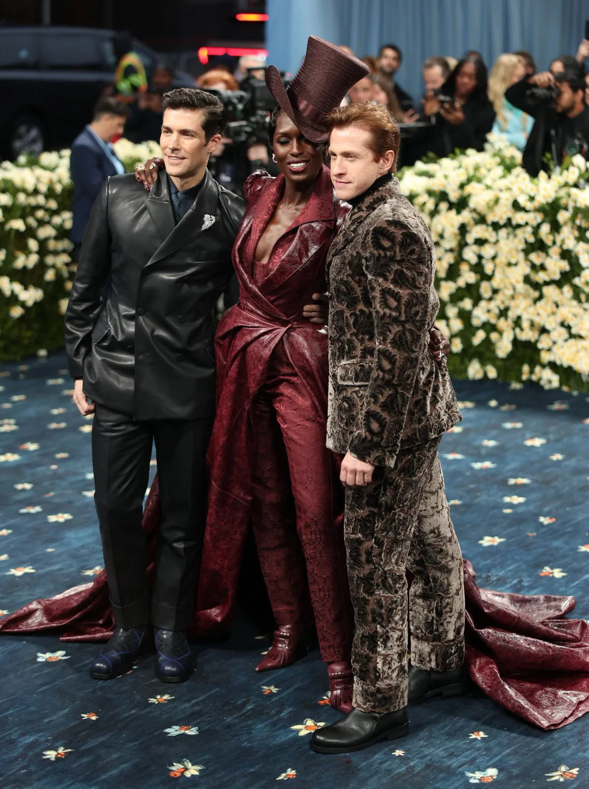 Her custom burgundy leather coat stole the spotlight with its striking embossed floral detailing and meticulous construction. The design featured a cinched waist that gracefully flowed into a subtle bustle, echoing the sculpted silhouettes of the Victorian era while meeting the gala’s “Tailored for You” dress code. A boldly styled top hat—an unexpected nod to equestrian chic—completed her look, highlighting the creative reinterpretation of menswear elements and infusing the outfit with a touch of regal panache.