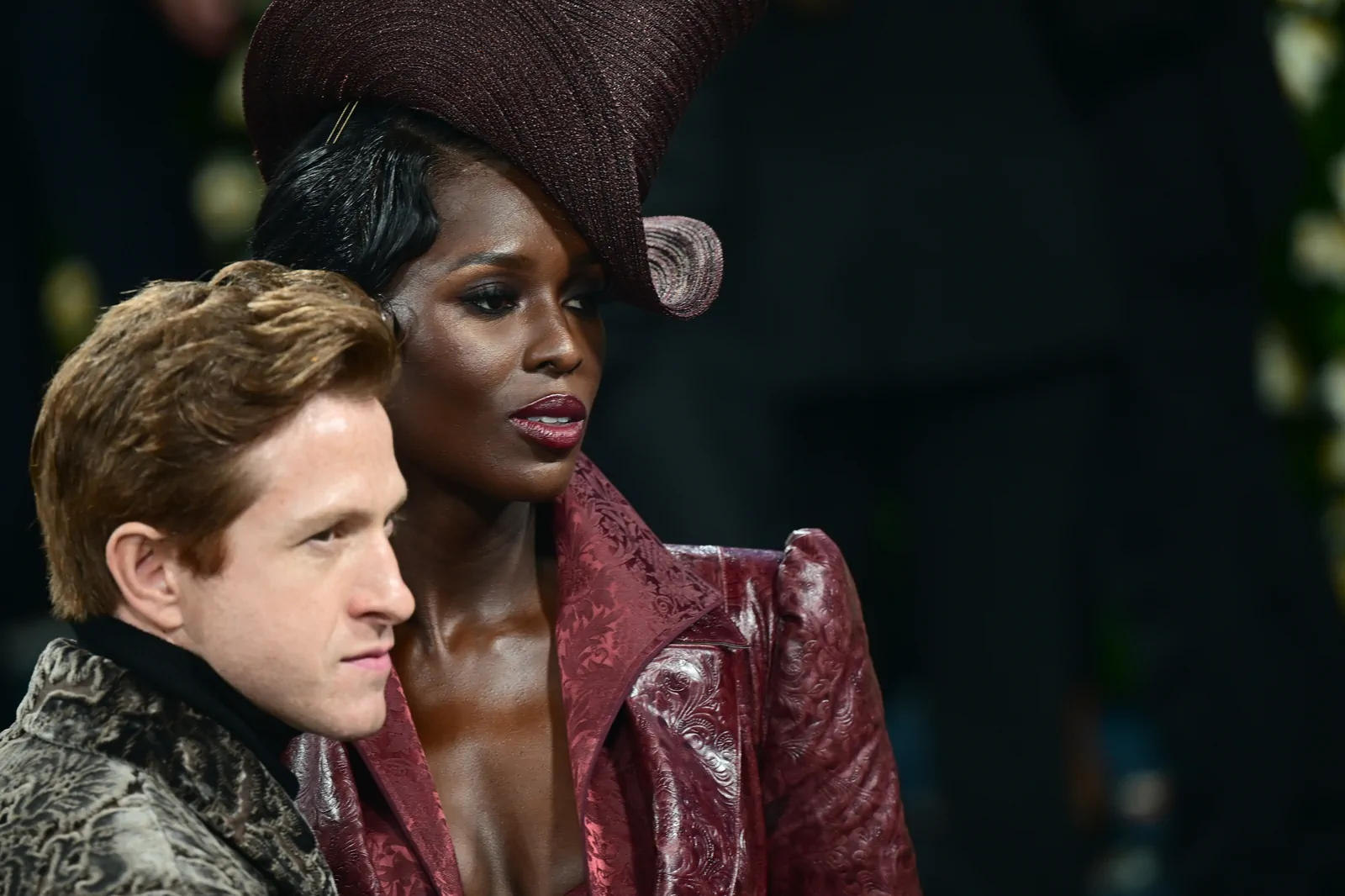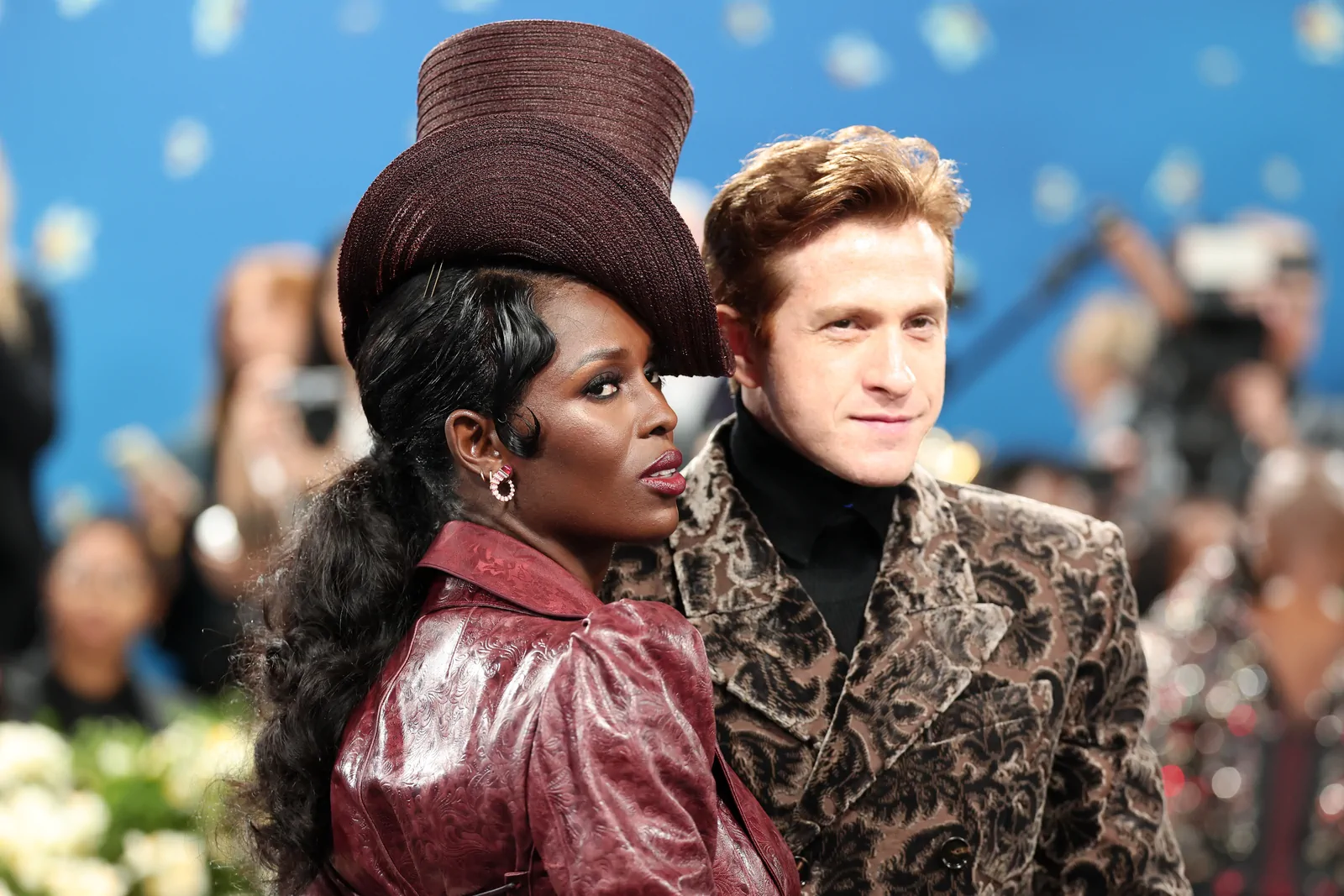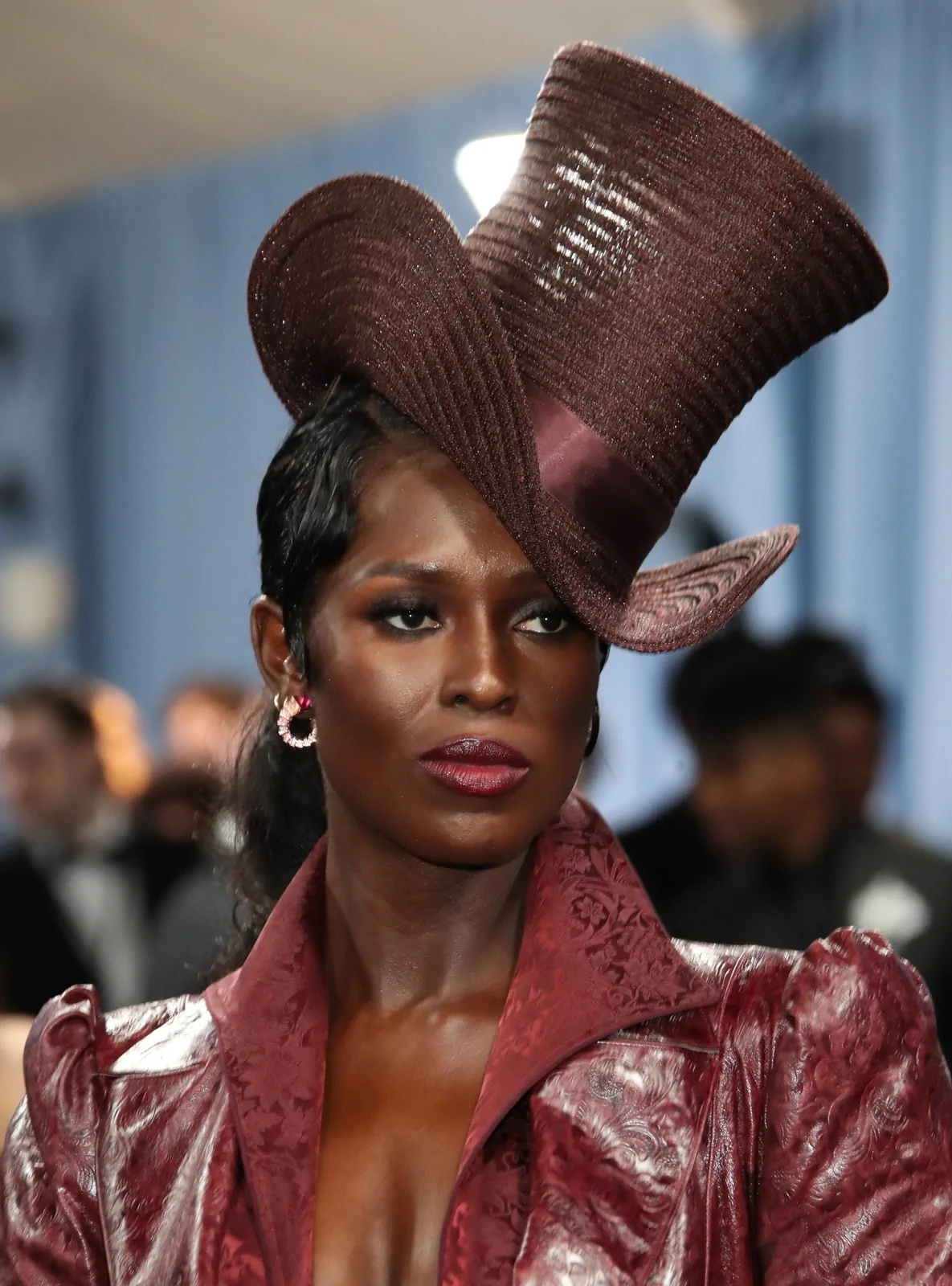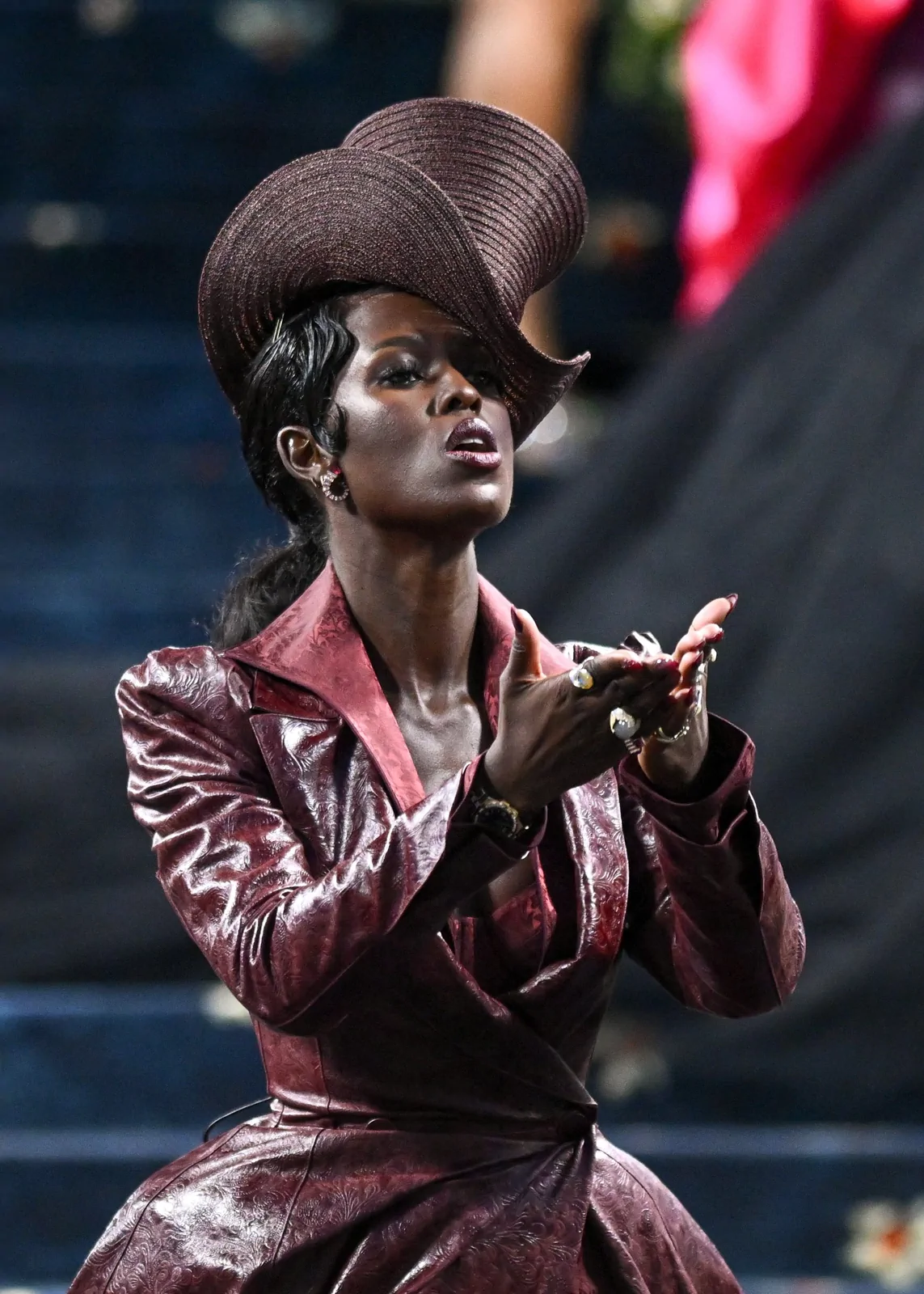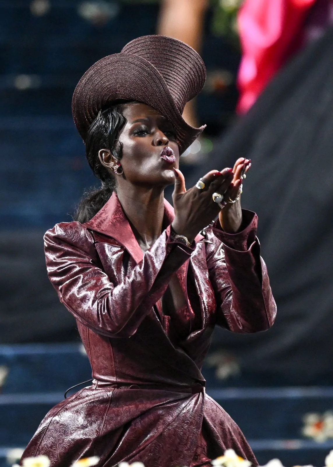 Her custom burgundy leather coat stole the spotlight with its striking embossed floral detailing and meticulous construction. The design featured a cinched waist that gracefully flowed into a subtle bustle, echoing the sculpted silhouettes of the Victorian era while meeting the gala’s “Tailored for You” dress code. A boldly styled top hat—an unexpected nod to equestrian chic—completed her look, highlighting the creative reinterpretation of menswear elements and infusing the outfit with a touch of regal panache.