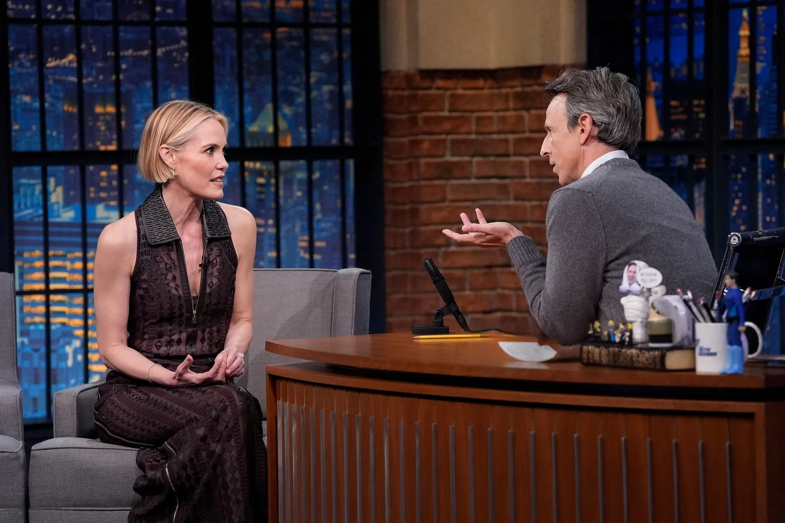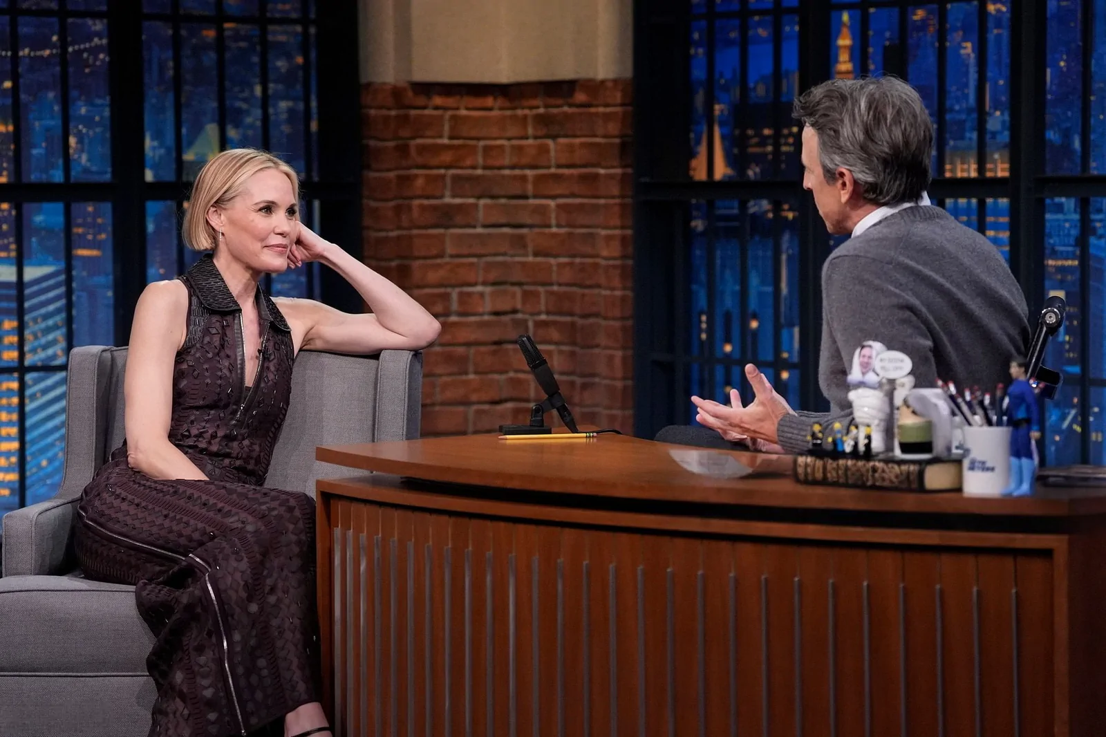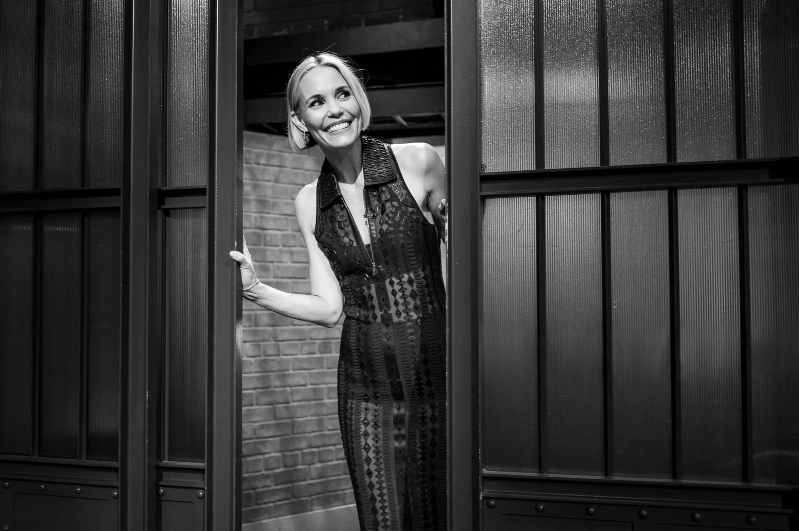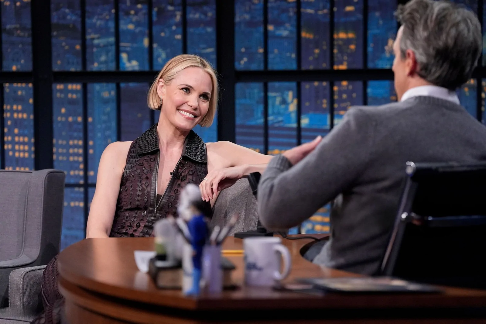 On May 14, 2025, on Late Night with Seth Meyers in New York, Leslie Bibb showcased a style that perfectly balanced modern ingenuity with timeless elegance. Choosing a standout look, she wore a collared Hermès Spring 2025 lace-panel dress that featured sheer, geometric panels and a daring thigh-high zip slit, striking a dynamic harmony between sophistication and contemporary edge. Her ensemble was elevated by a pair of sleek, black Giuseppe Zanotti Intriigo Knot 105 sandals, artfully grounding the look in modern luxury.