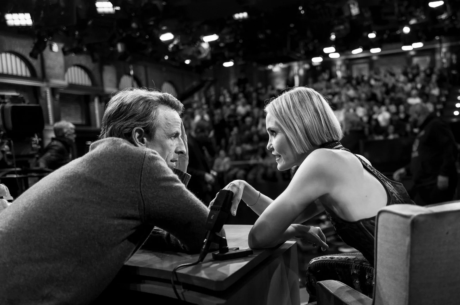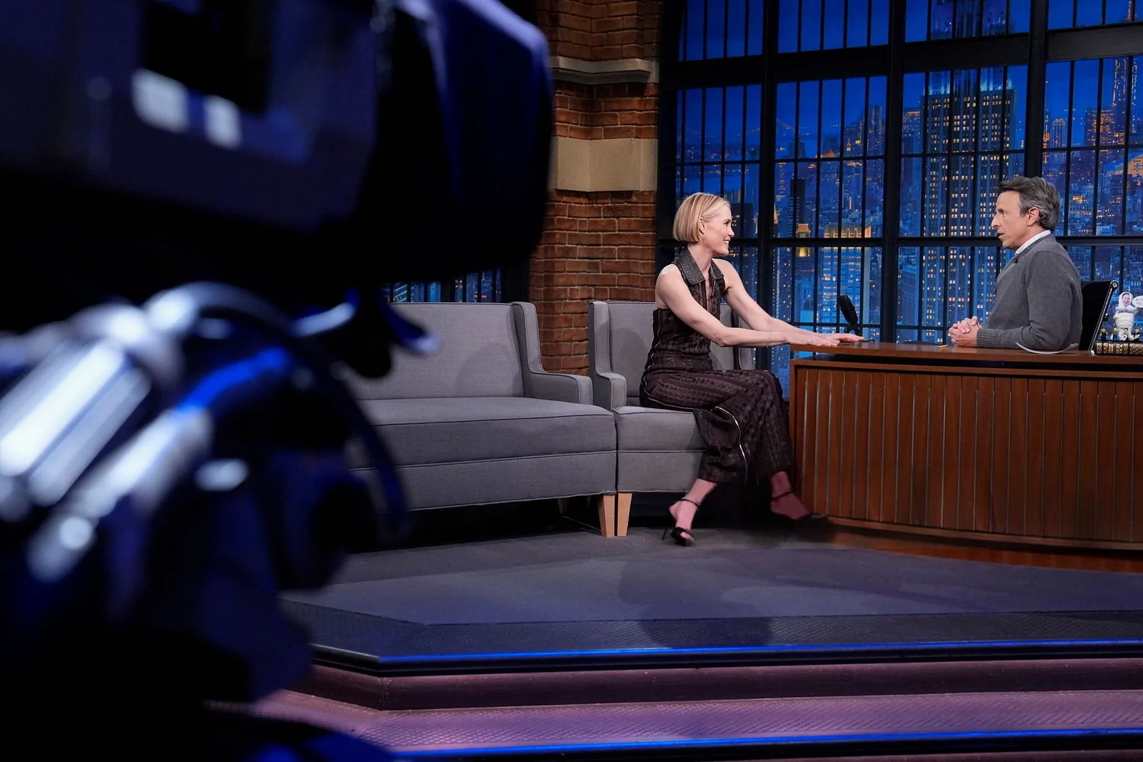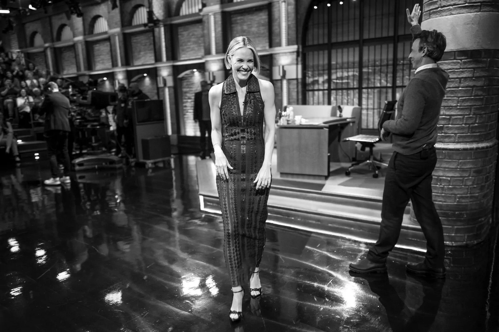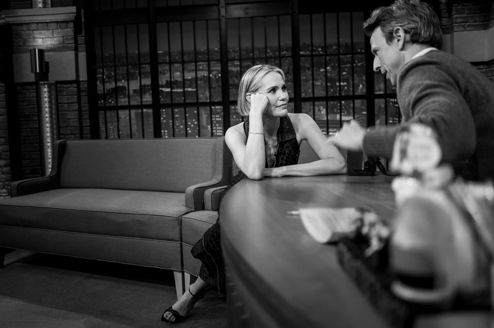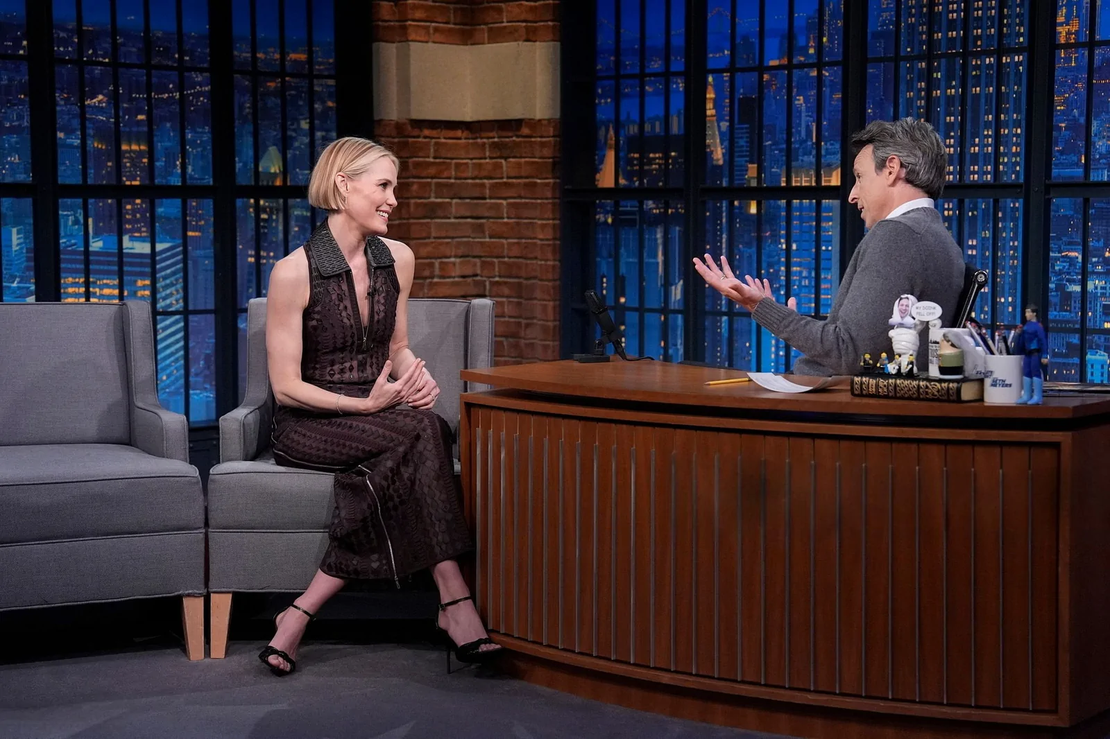 On May 14, 2025, on Late Night with Seth Meyers in New York, Leslie Bibb showcased a style that perfectly balanced modern ingenuity with timeless elegance. Choosing a standout look, she wore a collared Hermès Spring 2025 lace-panel dress that featured sheer, geometric panels and a daring thigh-high zip slit, striking a dynamic harmony between sophistication and contemporary edge. Her ensemble was elevated by a pair of sleek, black Giuseppe Zanotti Intriigo Knot 105 sandals, artfully grounding the look in modern luxury.