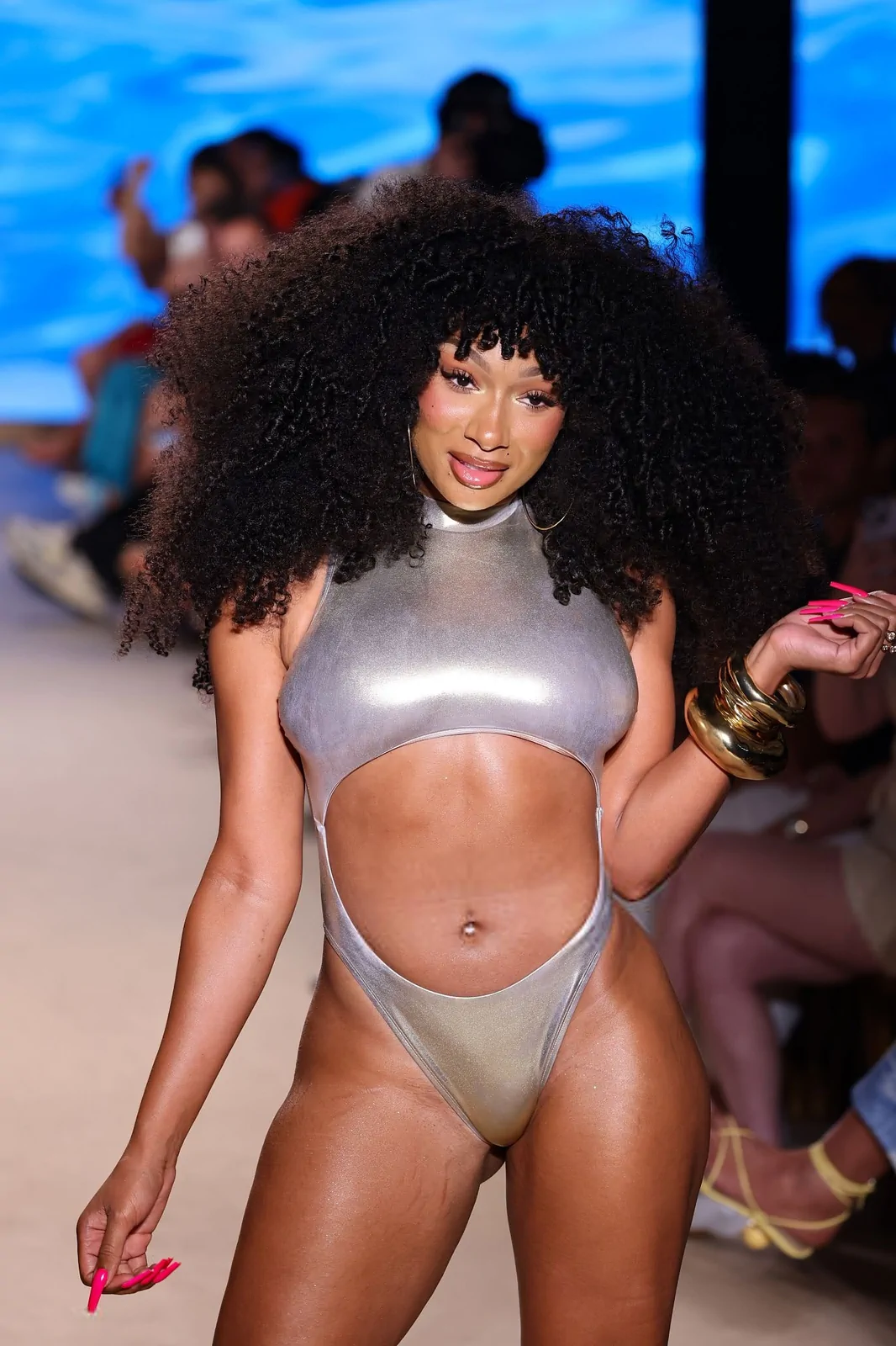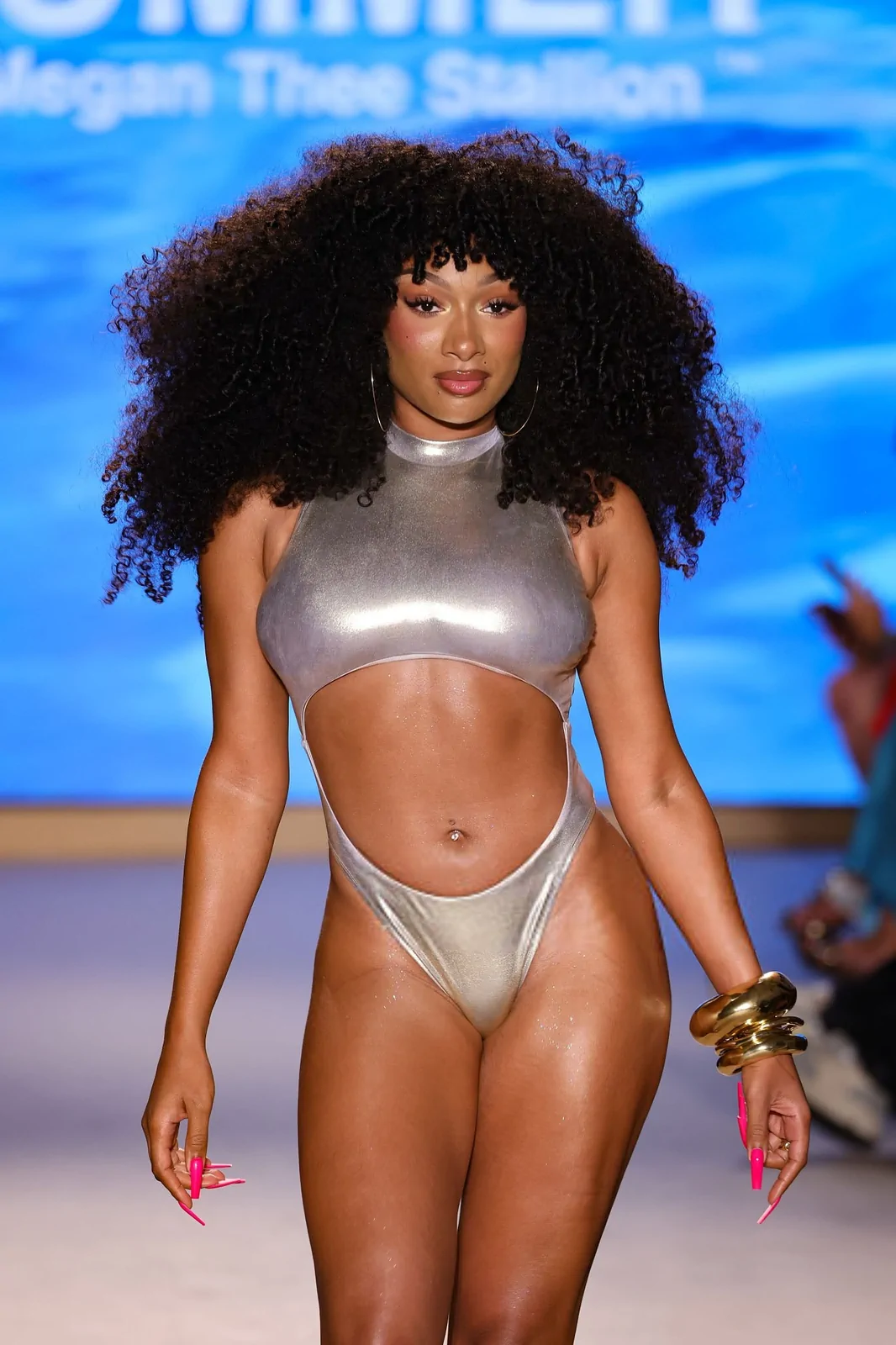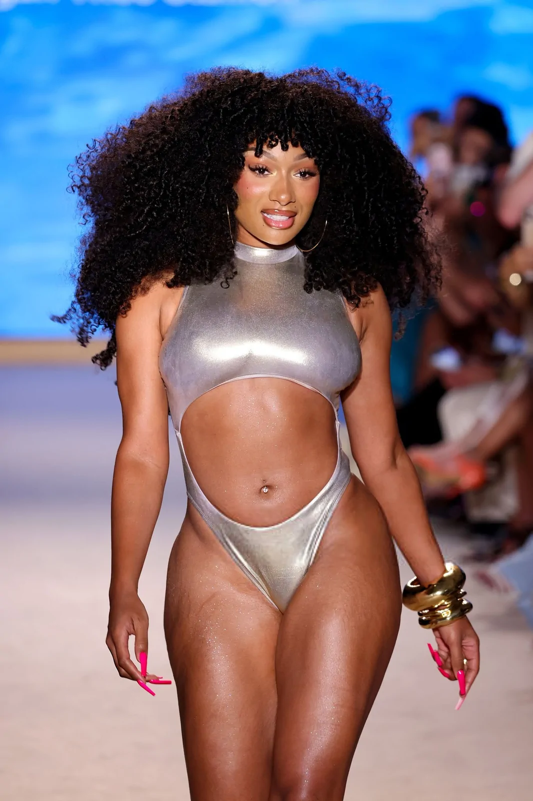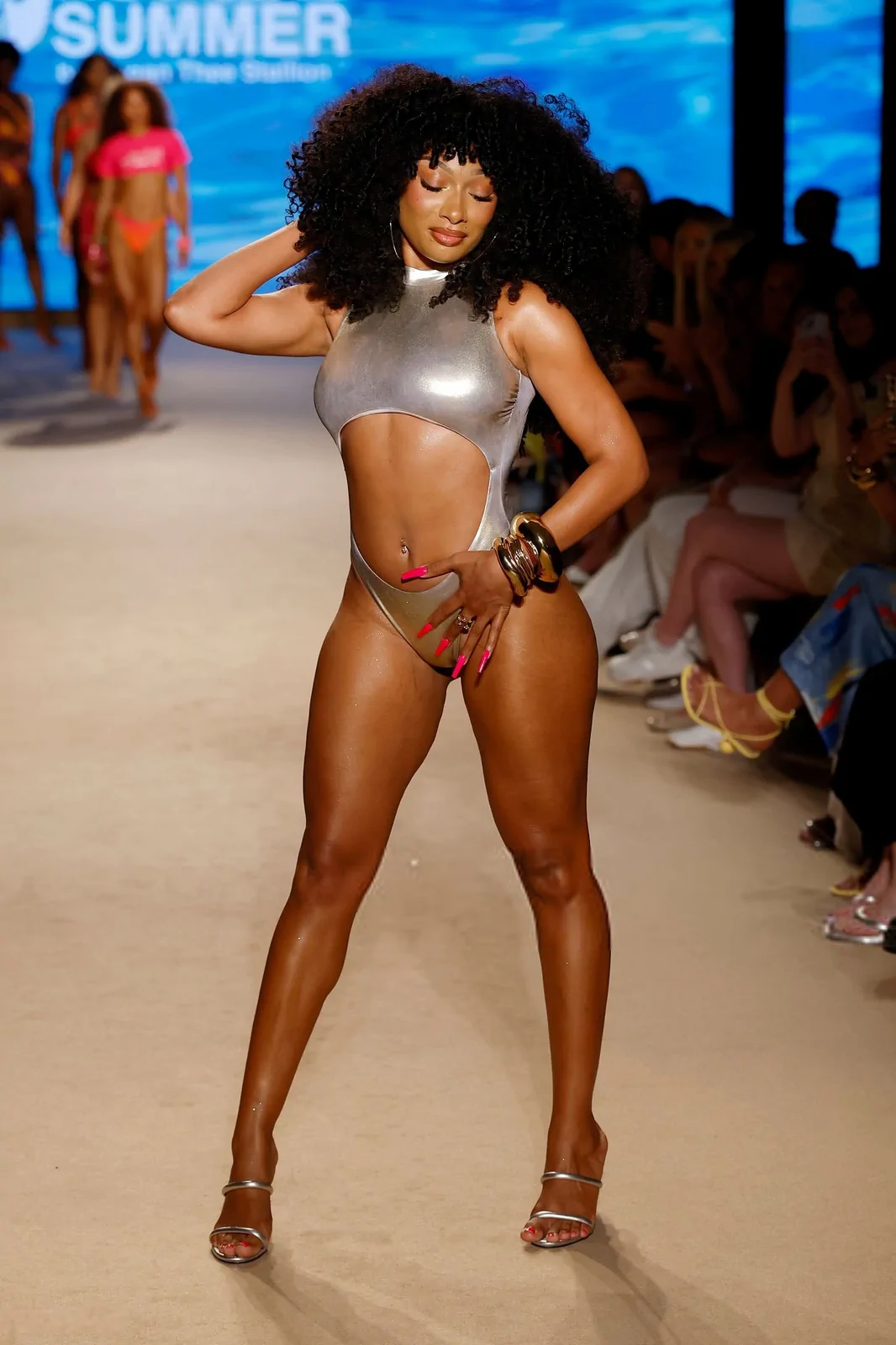Megan’s runway presence was as dynamic as her persona. The 30-year-old powerhouse strutted down the catwalk in a standout metallic-silver cutout bathing suit, a piece that perfectly embodied the collection’s modern edge while celebrating a playful, body-positive aesthetic. Her show was both a personal statement and a cultural milestone, as Megan emphasized her deep-rooted connection with the world of swimwear by sharing, “Everyone knows I love being near a pool or a beach, so I finally decided to turn my passion into a business and create my own swimwear brand.” This declaration was a nod not only to her own journey but also to the many fans who have long cherished her style—a style that now finds a new emblem in the “Hot Girl Summer” uniform, available at Walmart both in stores and online.