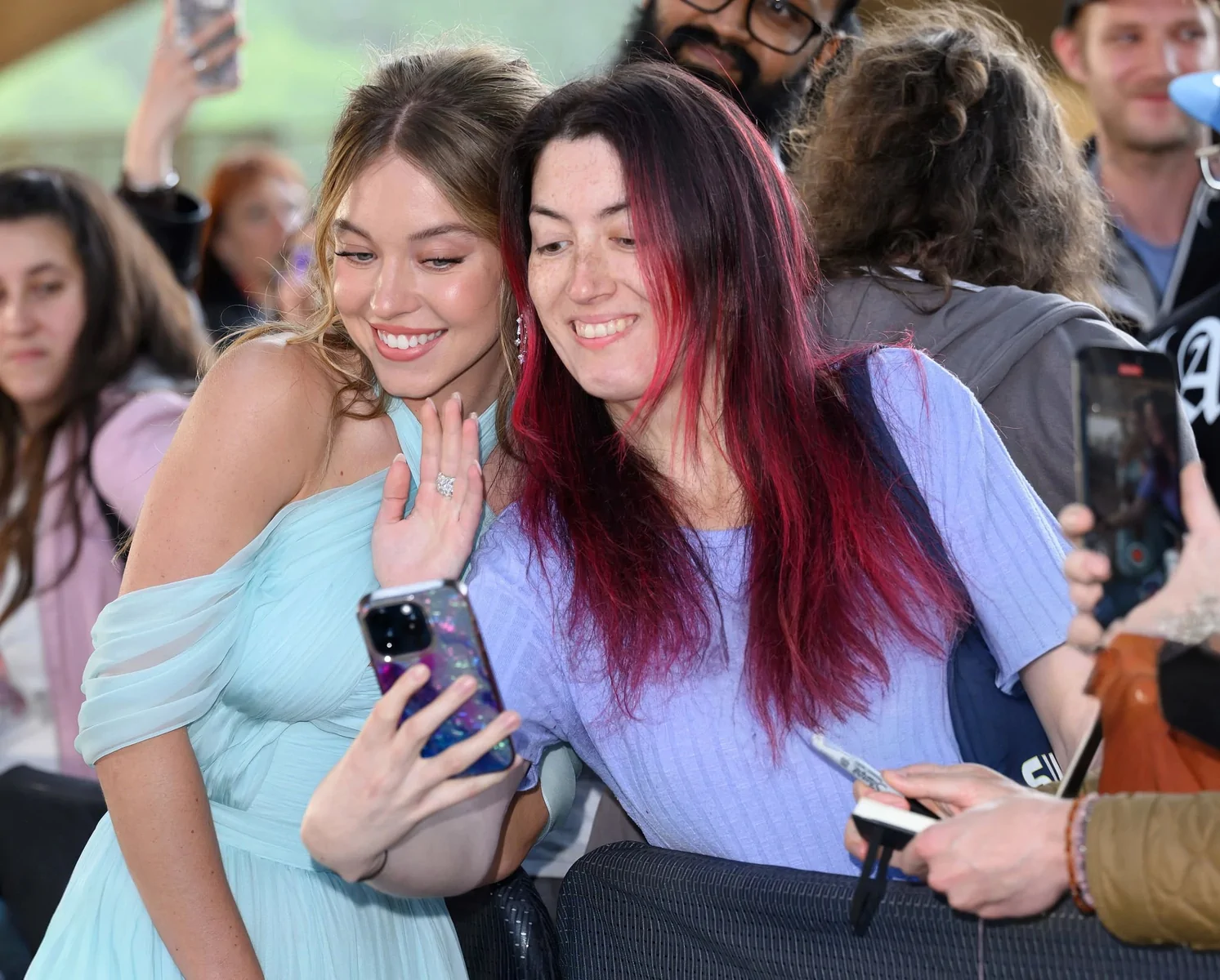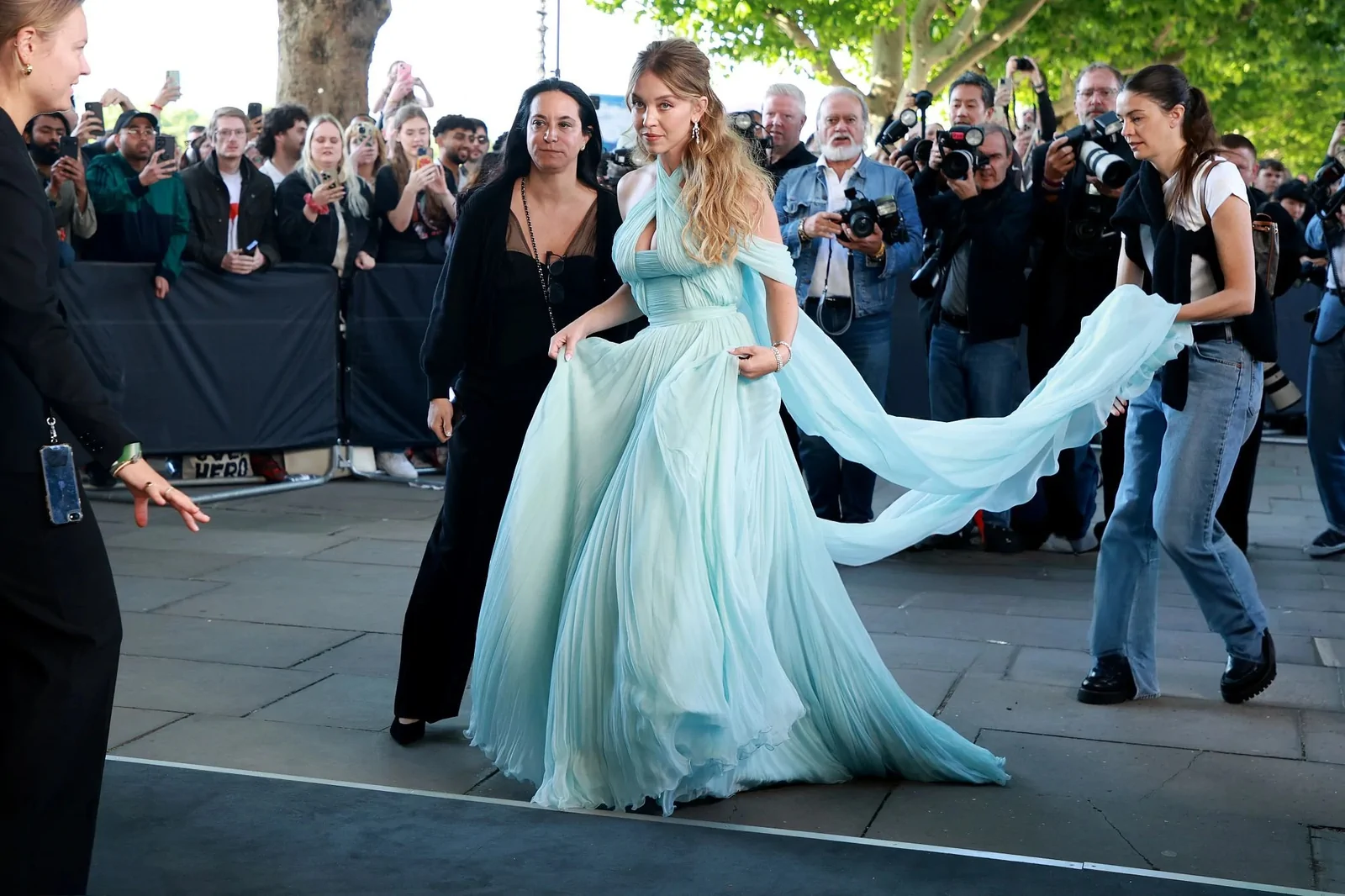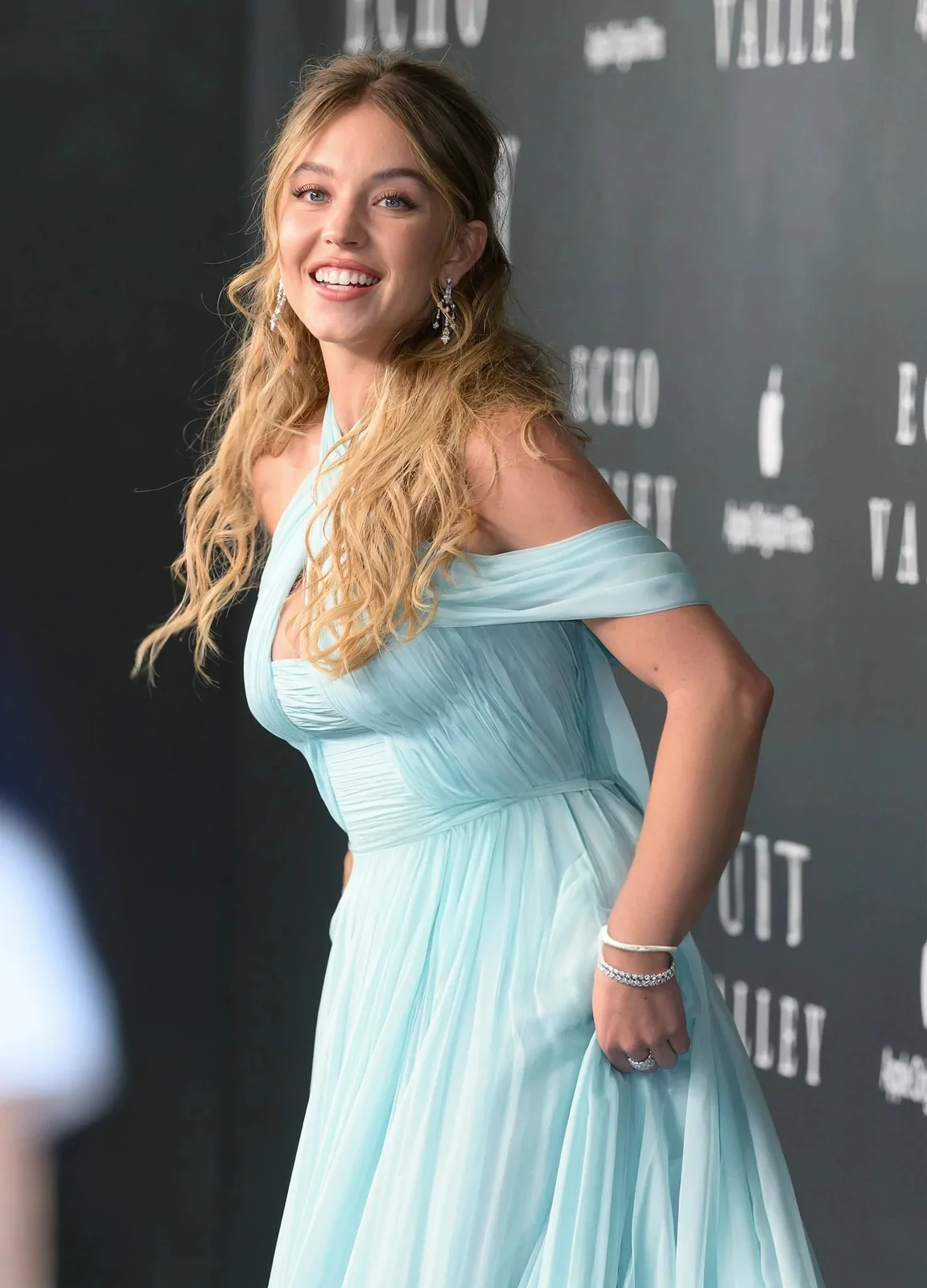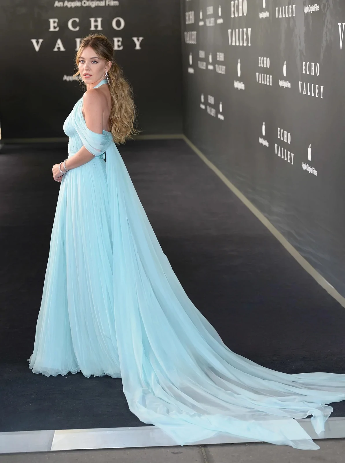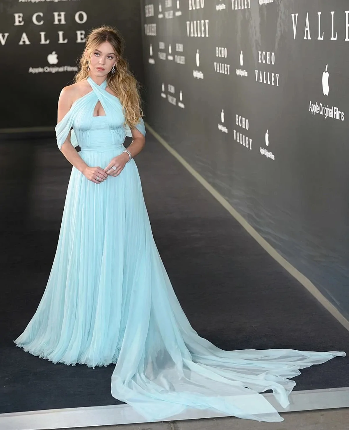 Sydney Sweeney graced the red carpet at the European premiere of “Echo Valley” at BFI Southbank in London. Captured by prominent press outlets, she exuded glamour in a stunning pale blue halterneck dress that showcased her figure with intricate design details—complete with sparkling silver earrings and loose, flowing blonde waves. Her look resonated with both cinema enthusiasts and fashion aficionados, perfectly complementing the film’s dramatic narrative and the evening’s sophisticated ambiance.