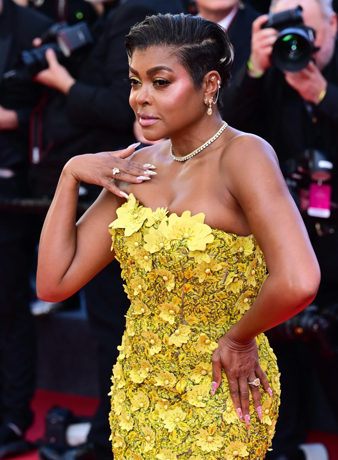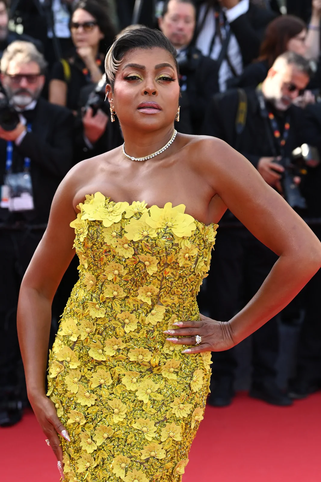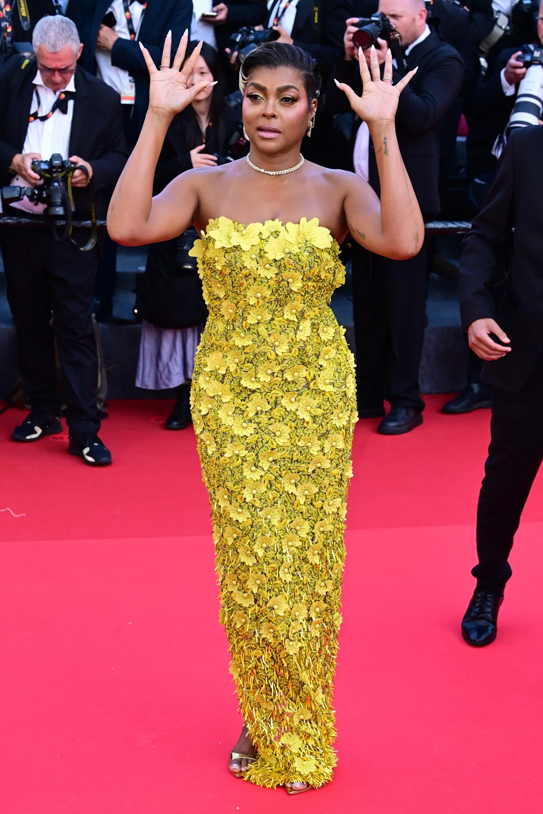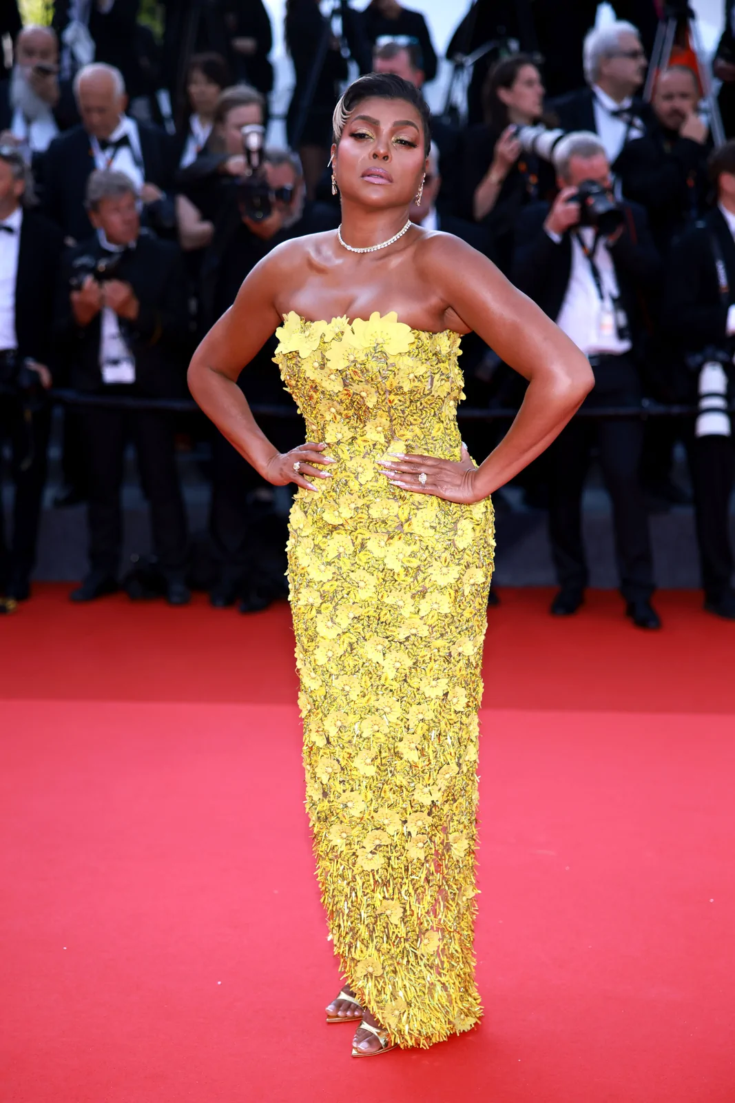 Taraji P. Henson lit up the Palais des Festivals on May 21, 2025, gracing the red carpet at the premiere of The History of Sound during the 78th Cannes Film Festival. She opted for a showstopping strapless butter yellow gown from Oscar de la Renta’s fall 2025 collection—an ensemble that combined classic glamour with modern detailing. The floor-length dress boasted delicate floral embellishments and sculptural floral appliqués on the bodice, which seamlessly gave way to a voluminous tulle skirt that exuded both structure and ethereal movement. Her look was perfectly elevated with a pair of glossy gold Giuseppe Zanotti Itriigo Strap open-toe sandals featuring a slender four-inch stiletto, which added a sophisticated lift while drawing attention to the intricate design of the gown’s details.