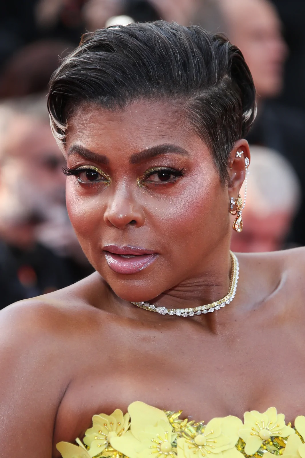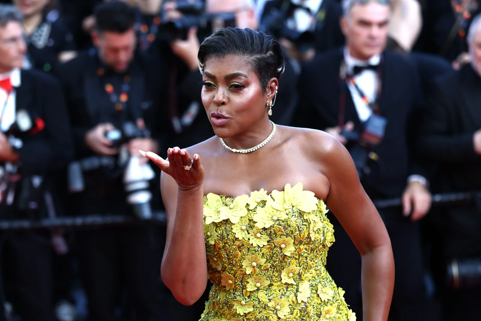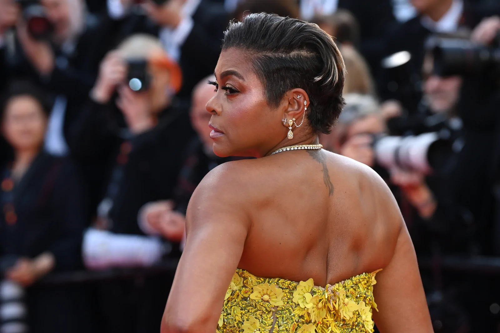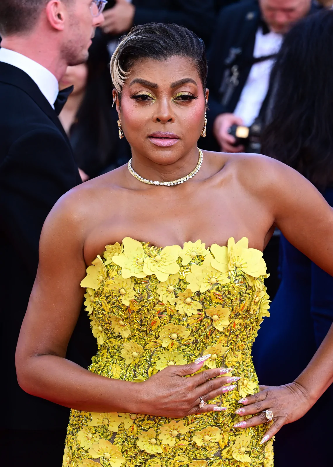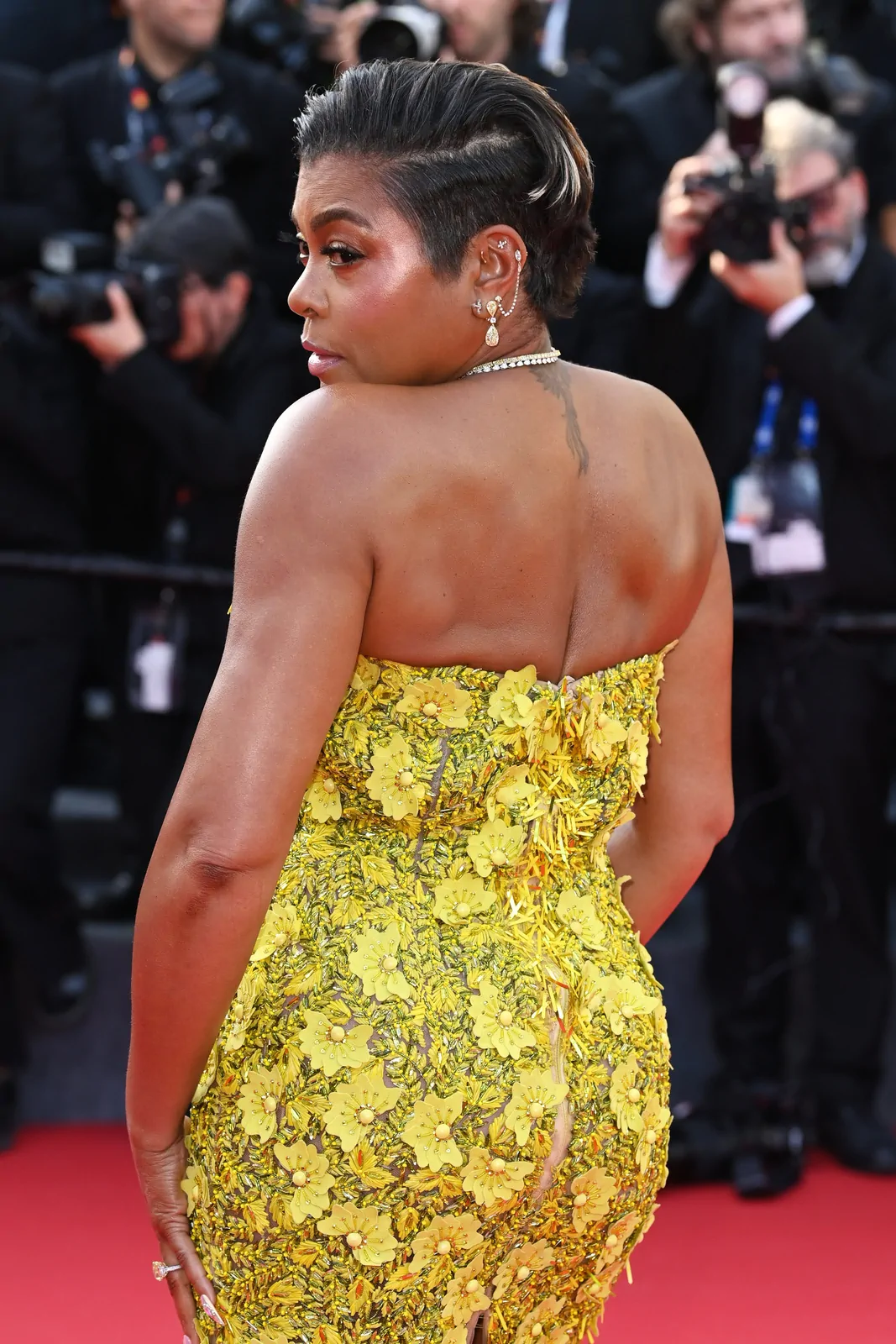 Taraji P. Henson lit up the Palais des Festivals on May 21, 2025, gracing the red carpet at the premiere of The History of Sound during the 78th Cannes Film Festival. She opted for a showstopping strapless butter yellow gown from Oscar de la Renta’s fall 2025 collection—an ensemble that combined classic glamour with modern detailing. The floor-length dress boasted delicate floral embellishments and sculptural floral appliqués on the bodice, which seamlessly gave way to a voluminous tulle skirt that exuded both structure and ethereal movement. Her look was perfectly elevated with a pair of glossy gold Giuseppe Zanotti Itriigo Strap open-toe sandals featuring a slender four-inch stiletto, which added a sophisticated lift while drawing attention to the intricate design of the gown’s details.