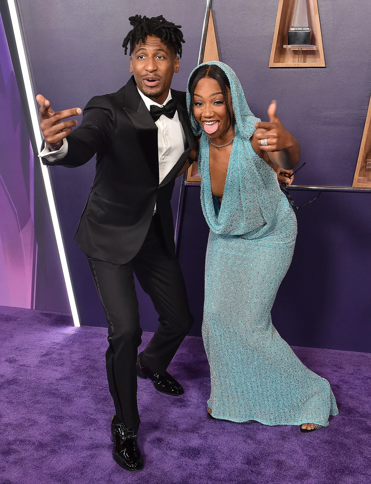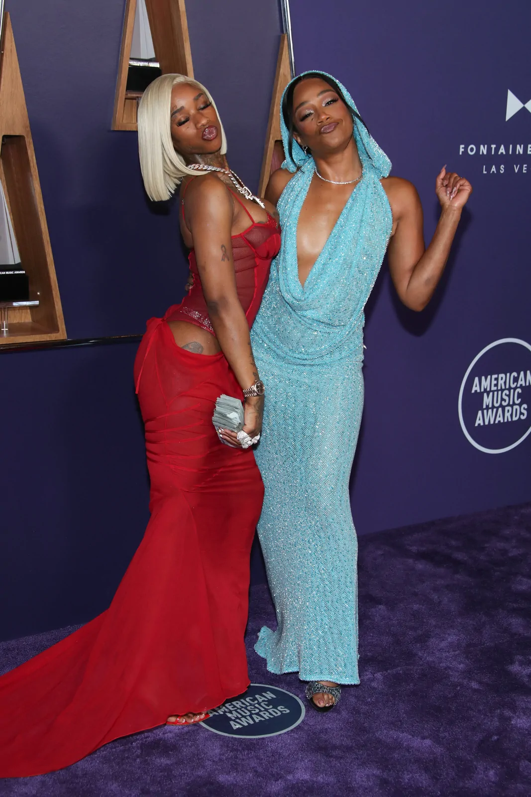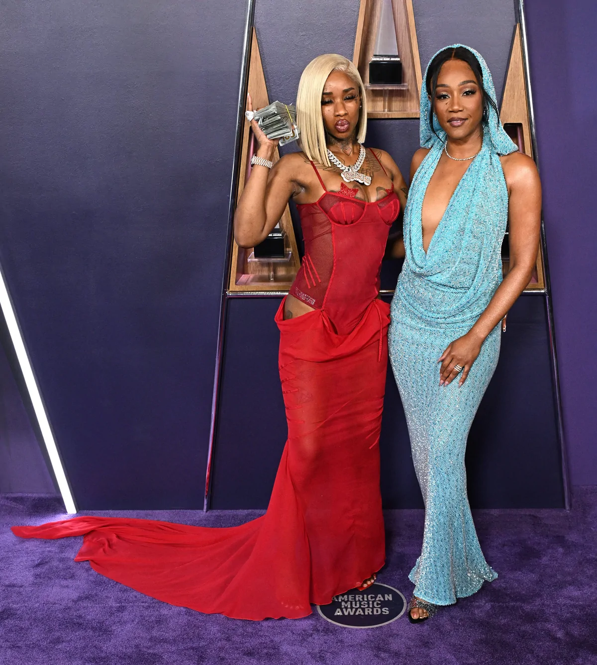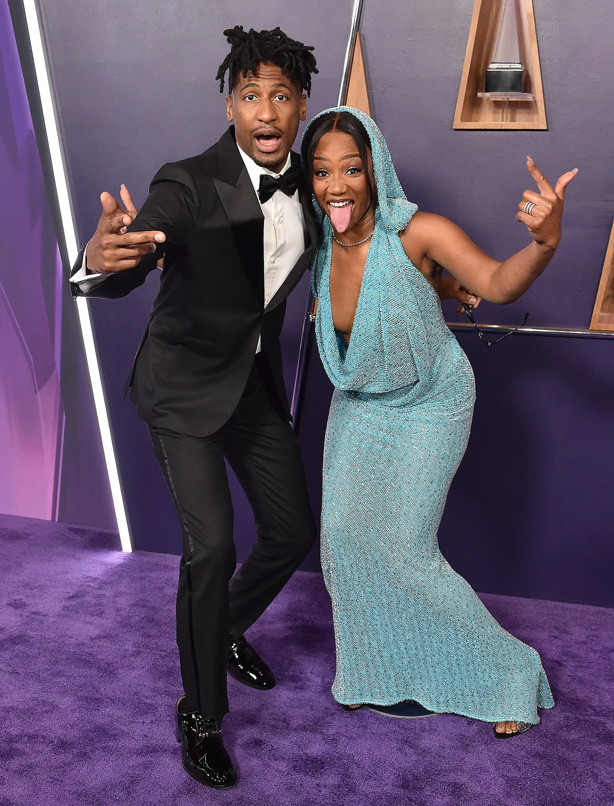 At the 2025 American Music Awards on May 26 in Las Vegas, Tiffany Haddish proved once again that she can effortlessly blend high-fashion elegance with her signature humor and magnetic stage presence. Arriving as one of the evening’s standout presenters, she donned a striking floor-length knit blue dress from Bronx and Banco. The dress, crafted with teal threads interwoven with silver and darker blue hues, offered a fresh update on red carpet chic—effortlessly marrying playful vibes with a refined silhouette. Completing her look were open-toe, beaded mules by Giuseppe Zanotti, which added a dazzling element and reinforced her status as a red carpet style icon.